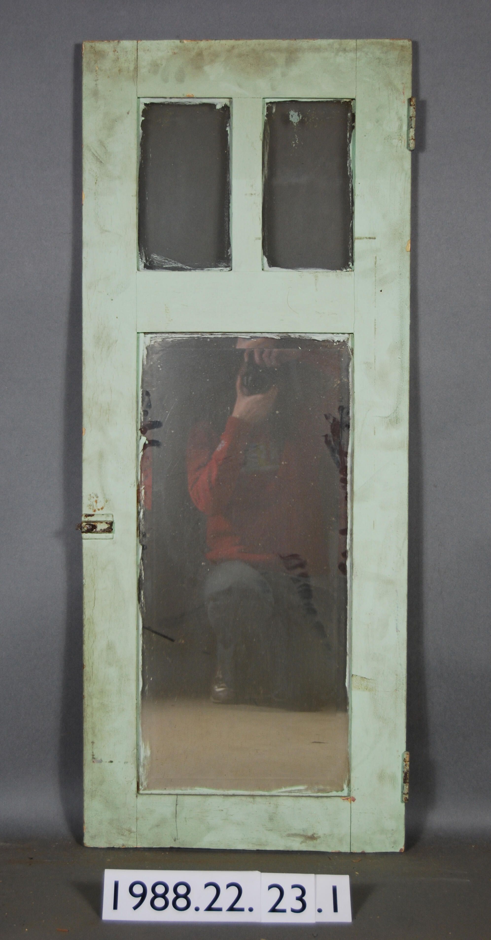 Rectangular. Segmented three openings divided by vertical muntin and horizontal mullion. Upper two openings have complete clear colorless glass panes. Bottom opening has complete beveled mirror and plywood backing. Has two complete iron butt hinges. Iron spring latch.