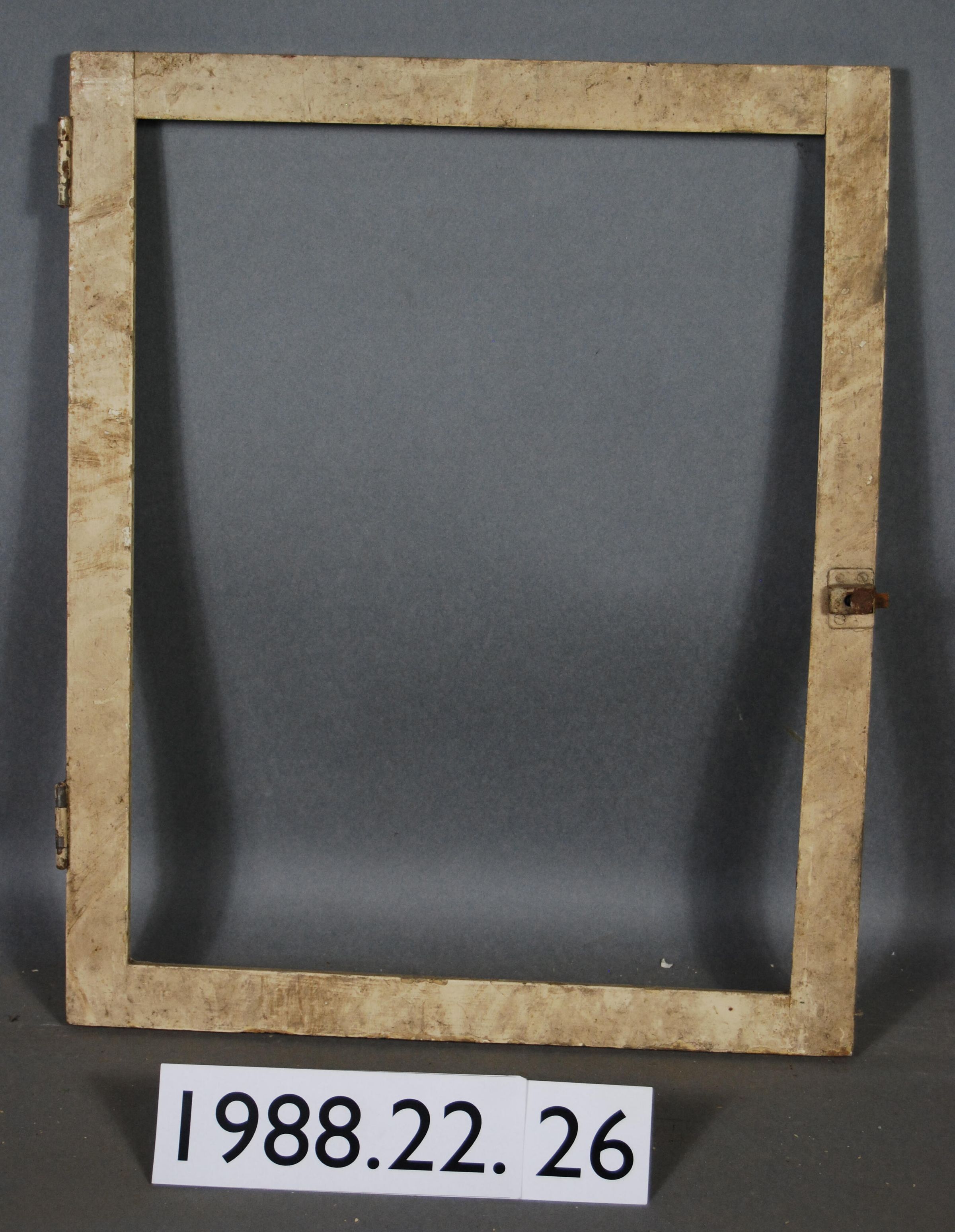 Rectangular. Single opening originally with mirror and board backing. Both are missing. Has two complete iron hinges. One iron spring latch.