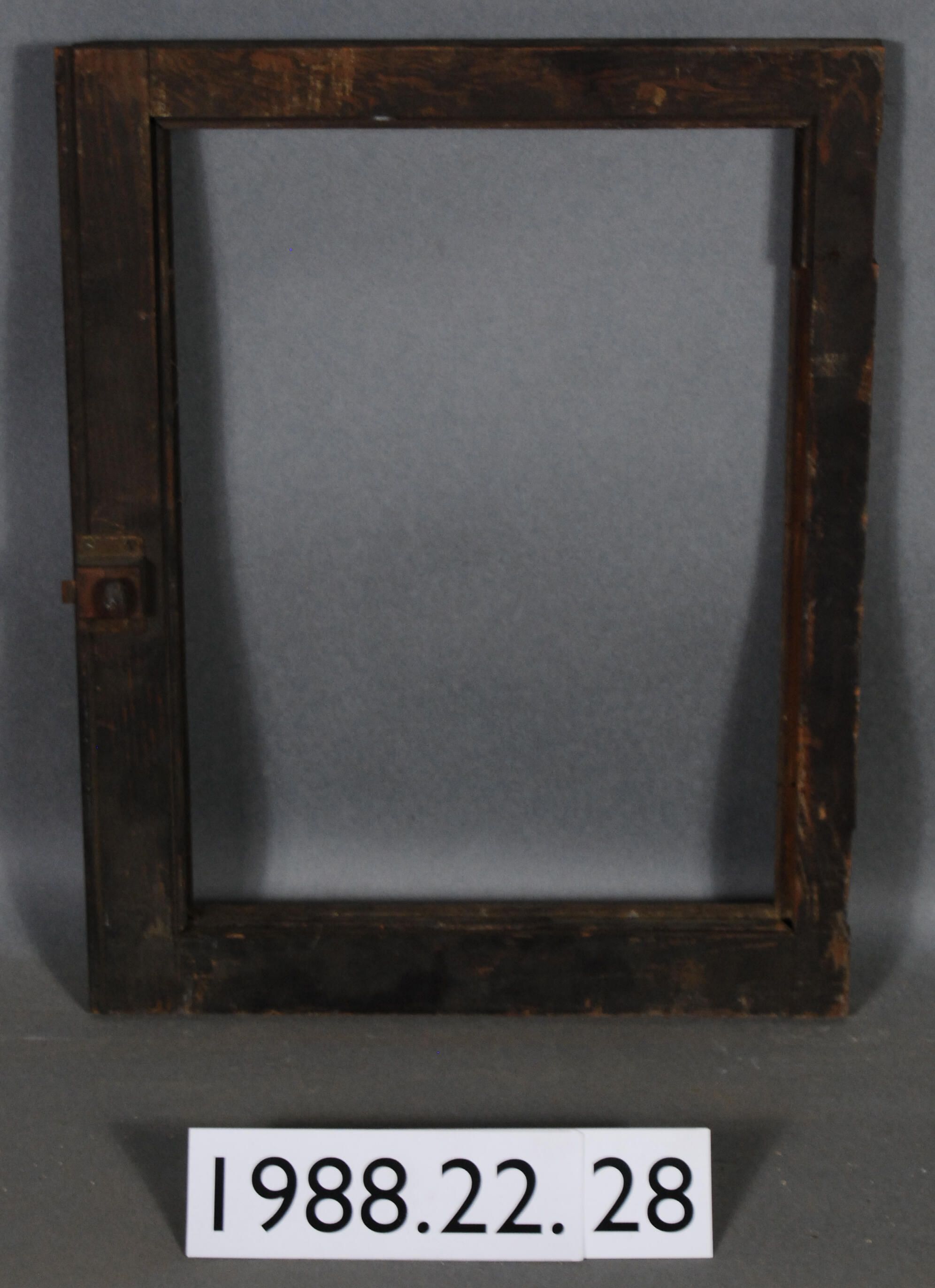 Rectangular. Single opening. Glass pane is missing. Both butt hinges are missing. Has brass spring latch.