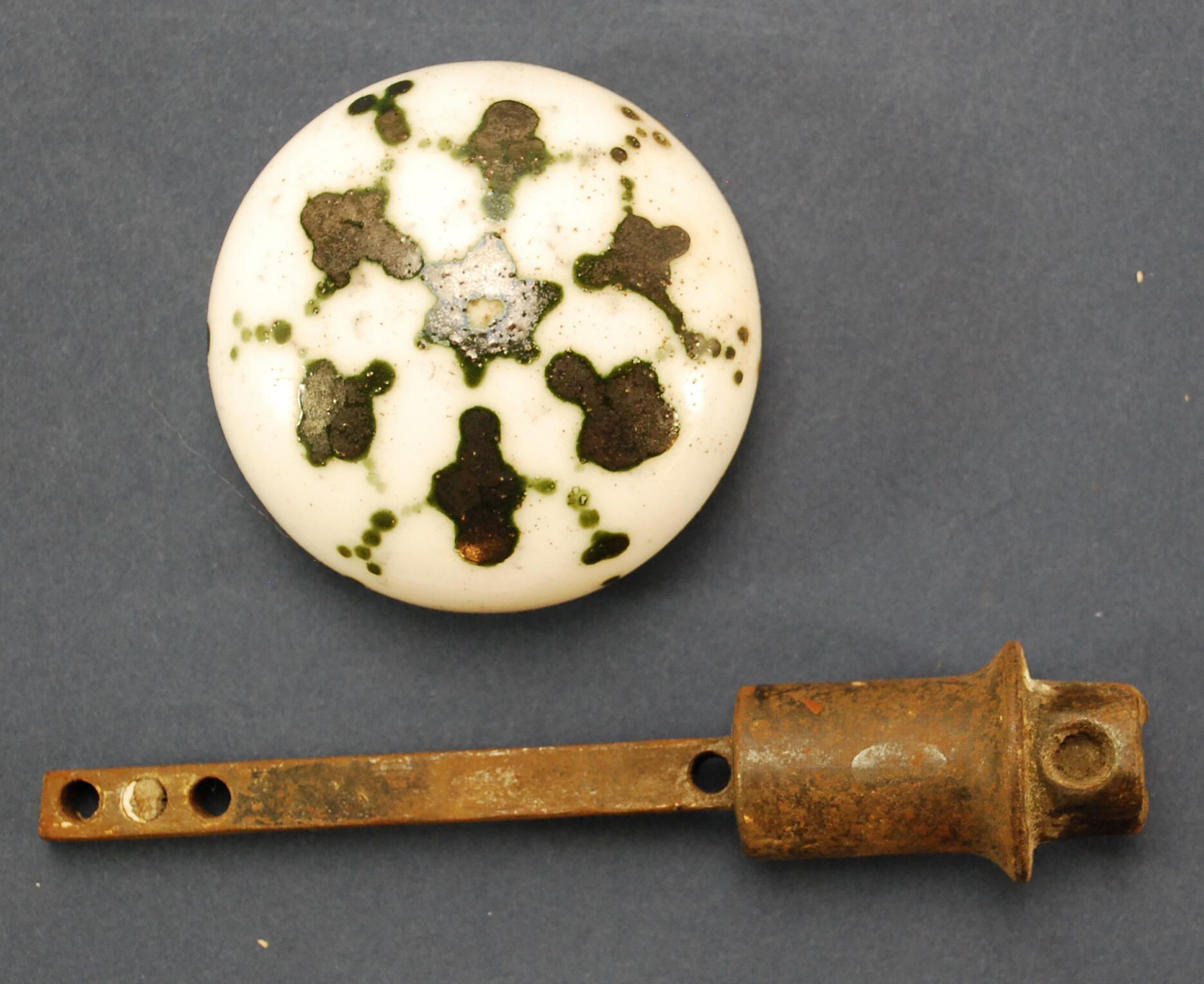 Design Name: Manufacturer: unknown Style: Vernacular Material: Porcelain Manufacturing Method: Surface Finish: Aged / Unpolished VDA Classification: VDA Number: Shape: Domed Patent Specifics: Lock Type (If Applicable): Inscription/Makers Mark: Inscription Text: Comments: Greenish-black radial design glazed in there crude, shank detached from knob.