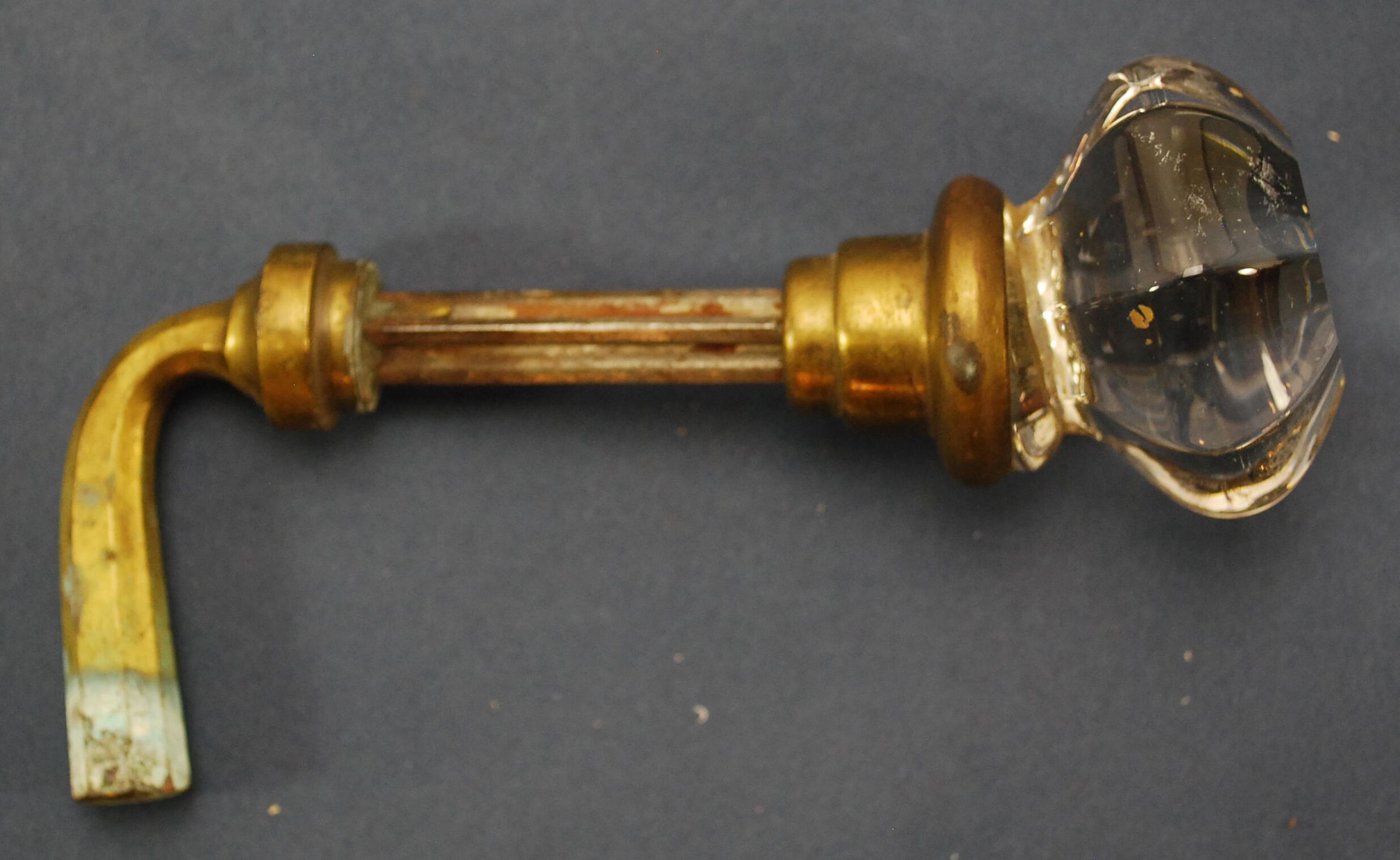 Design Name: Manufacturer: unknown Style: Material: Glass Manufacturing Method: Pressed Surface Finish: VDA Classification: Glass VDA Number: Z Shape: Octagonal Patent Specifics: Lock Type (If Applicable): Inscription/Makers Mark: Inscription Text: Comments: Flat face, mounted on spindle with "L" handle, knob is skewed on mount.