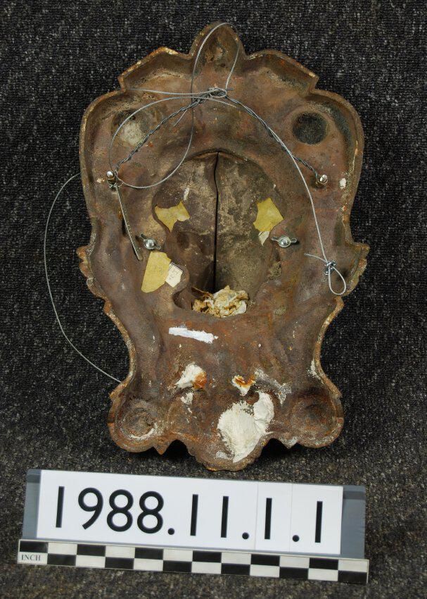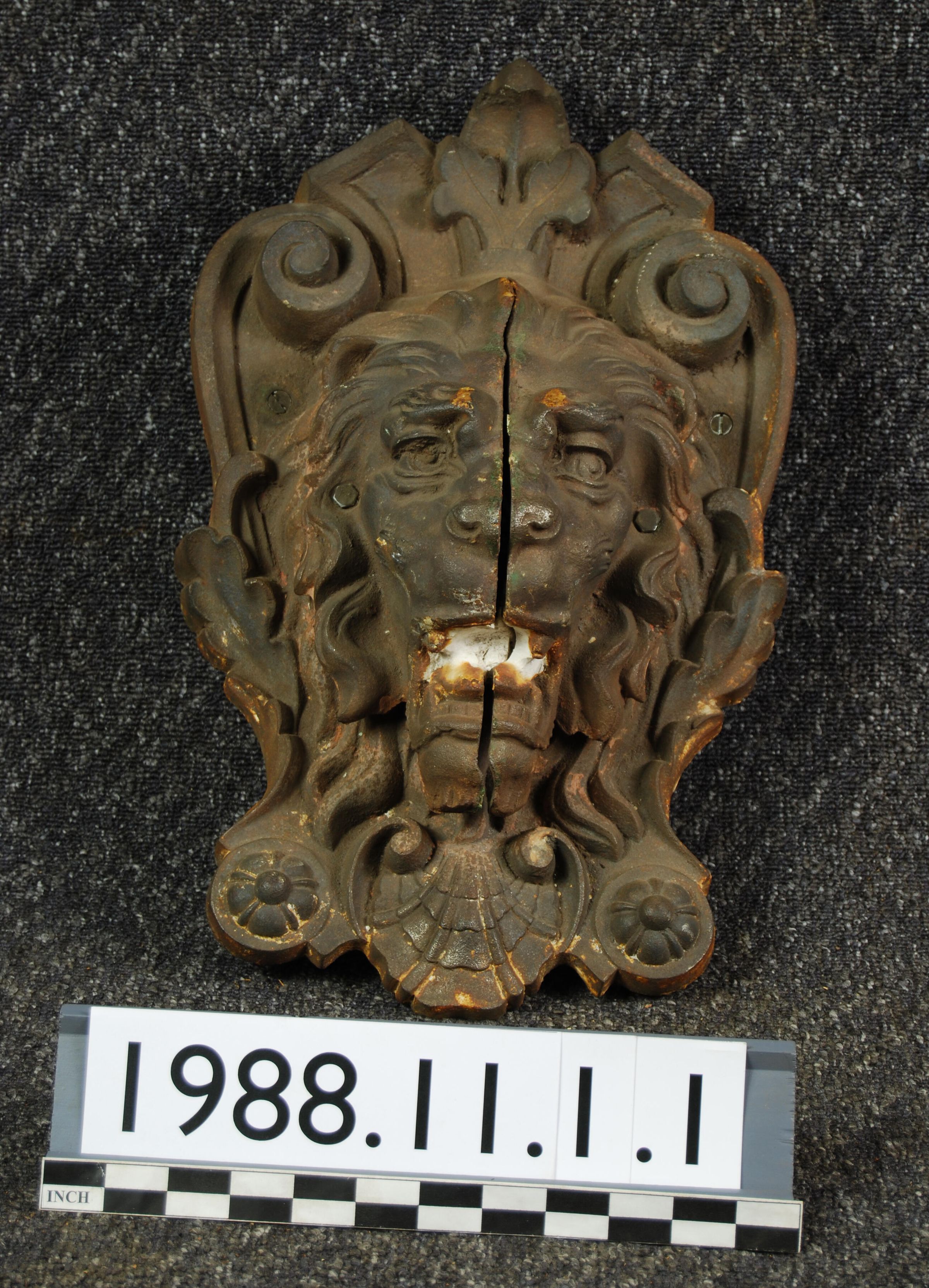 Lion head is composed of two separate pieces with open seam through center. Attached to shield motif with modern replacement bolts.