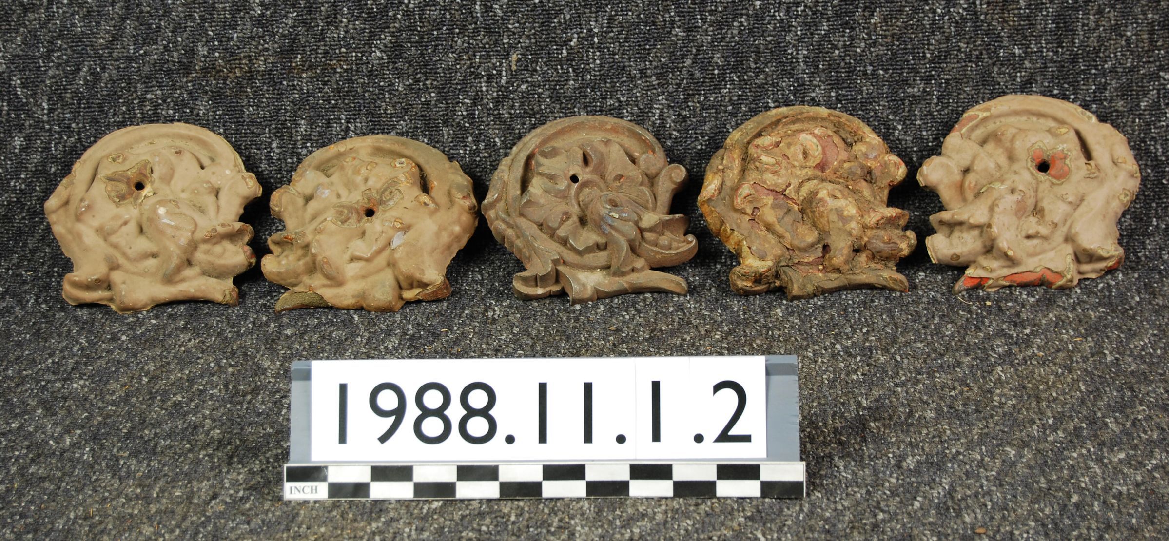 Originally each pilaster had two botanical motif ornaments mounted at each respective side of lion head. Of the five ornaments, two are right hand, three are left hand. One ornament is partially stripped of paint.
