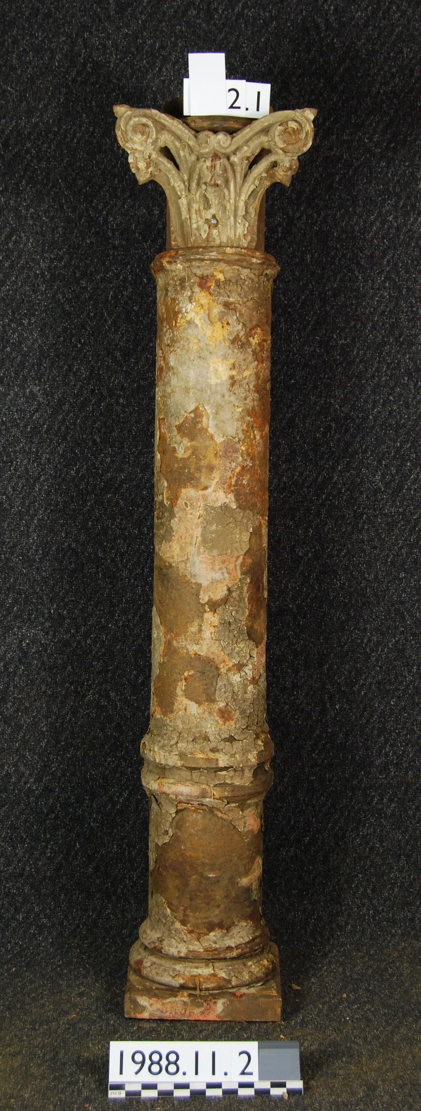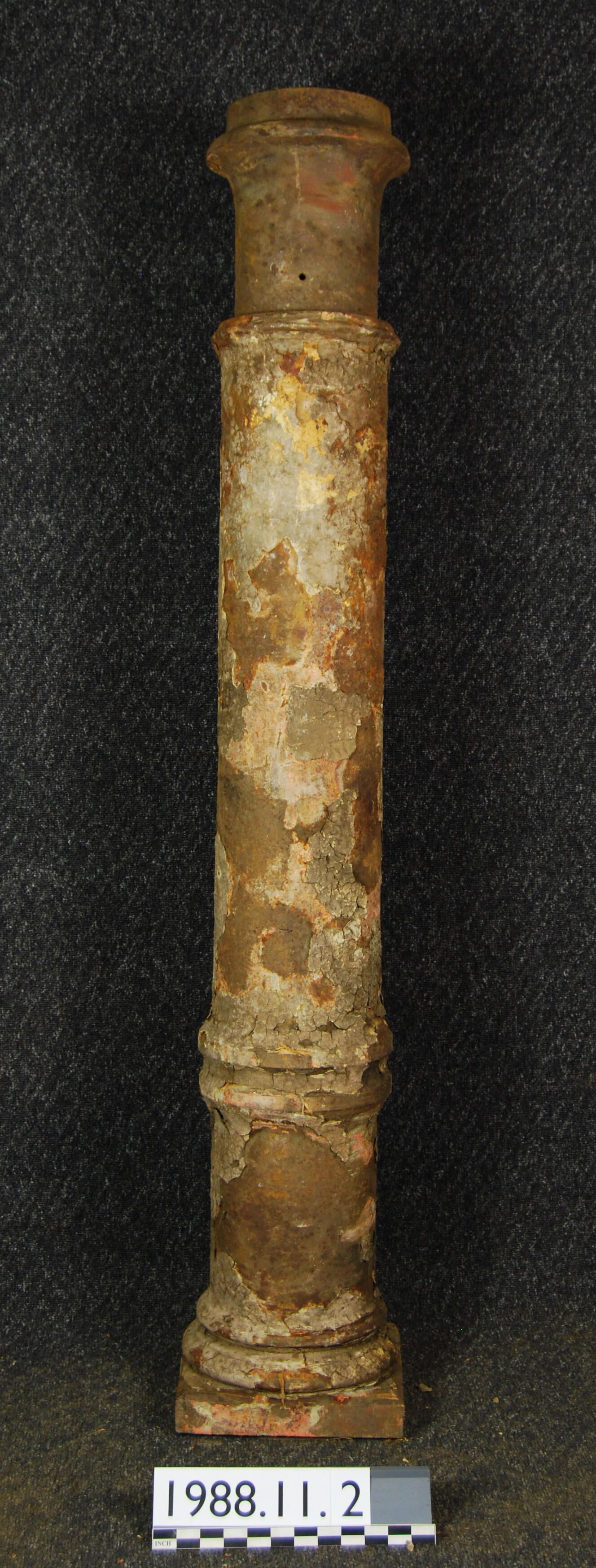 Hollow, cylindrical with square base. Has series of raised ornamental rings. Upper part of column has flange for mounting Corinthian style capital which is now detached.