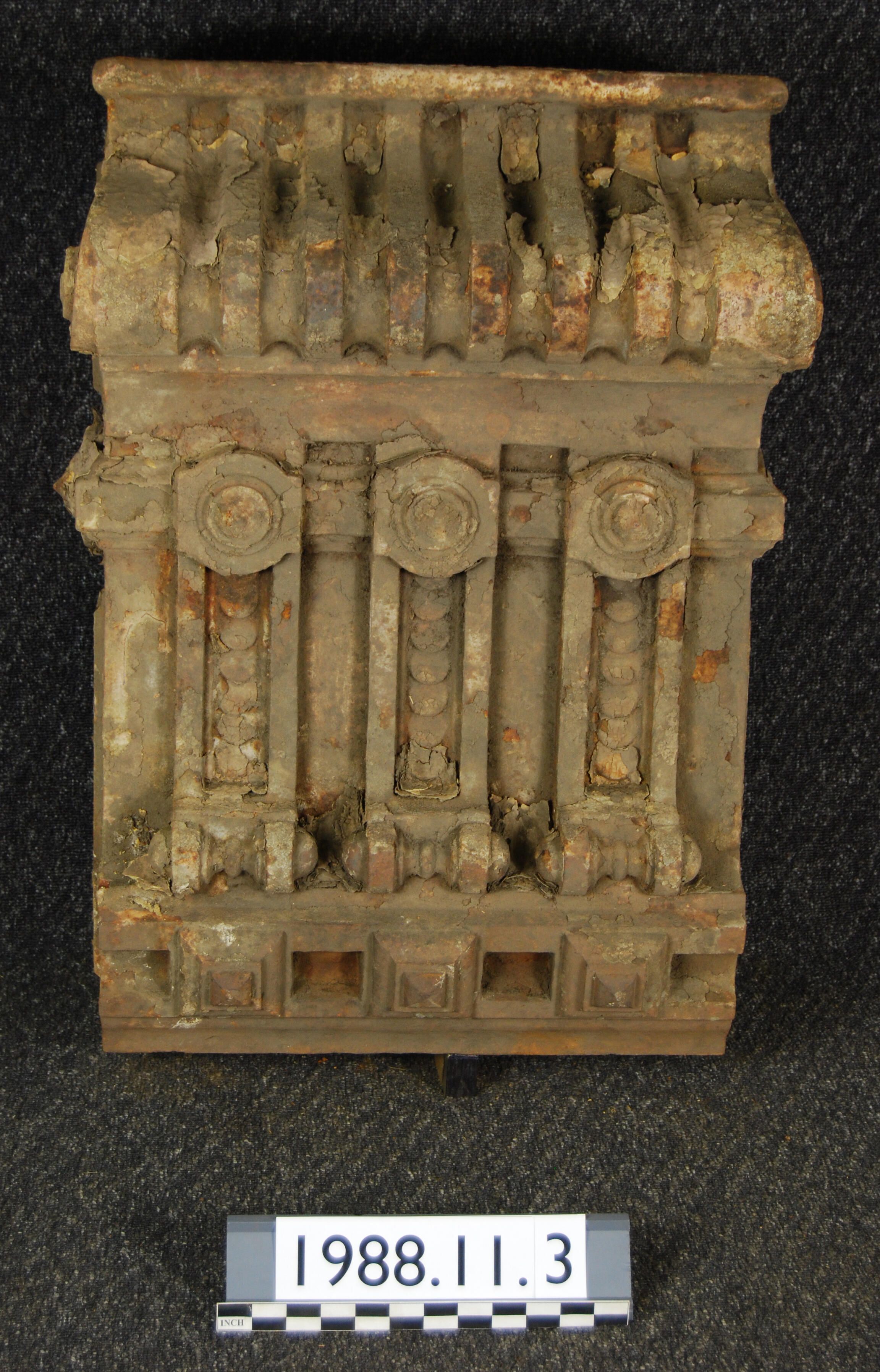 Cast iron pilaster ornament. Originally installed on Abington Building front facade, third floor.