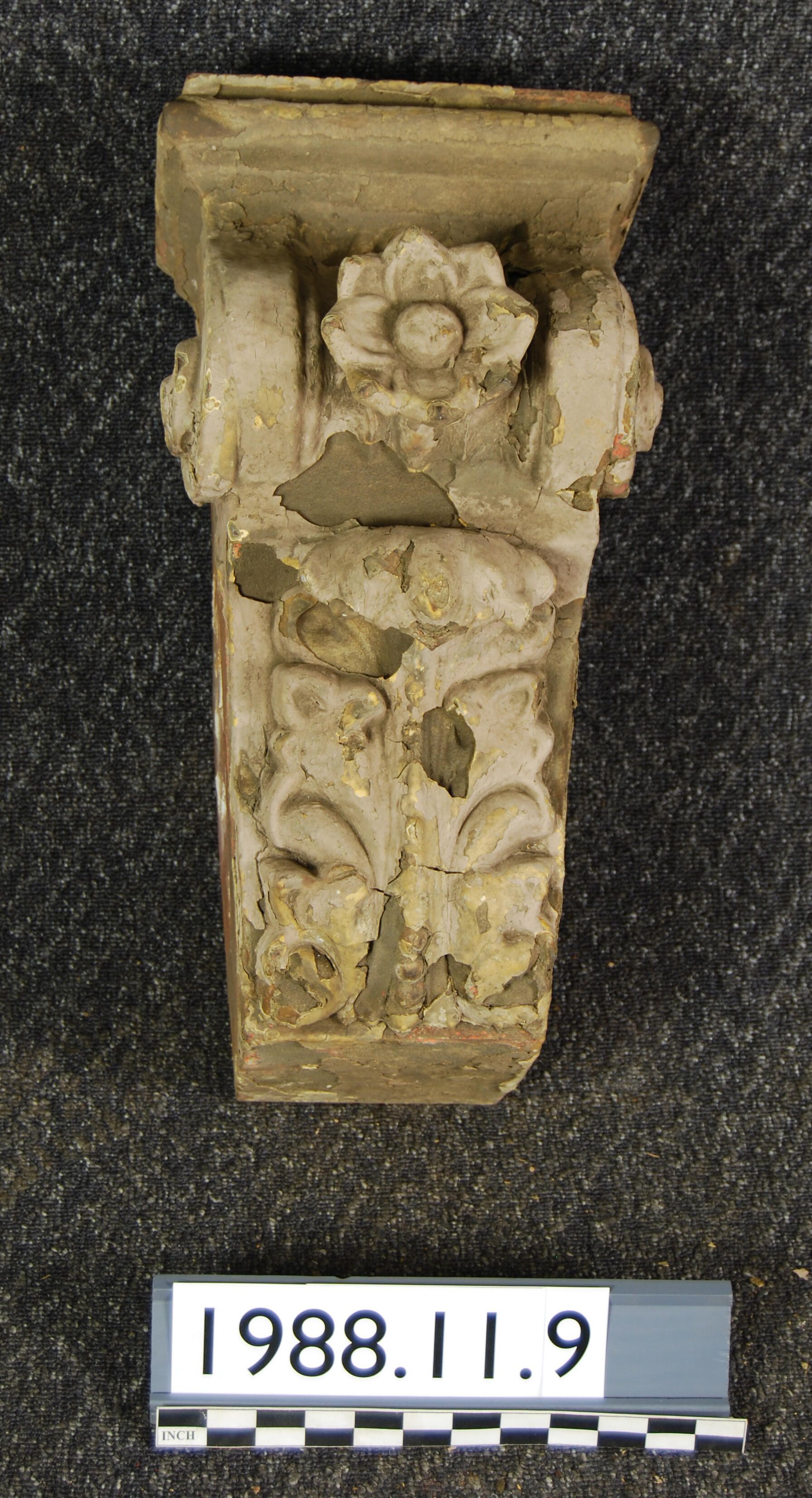 Hollow body. Flat top. Scrolled sides. Front has fluted reel with applied floral rosette. Acanthus leaf ornament bolted at lower front. Originally building had eight keystones of this design. This is one of four extant.