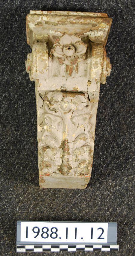 Hollow body. Flat top. Scrolled sides. Front has fluted reel with applied floral rosette. Acanthus leaf ornament bolted at lower front. Originally building had eight keystones of this design. This is one of four extant.