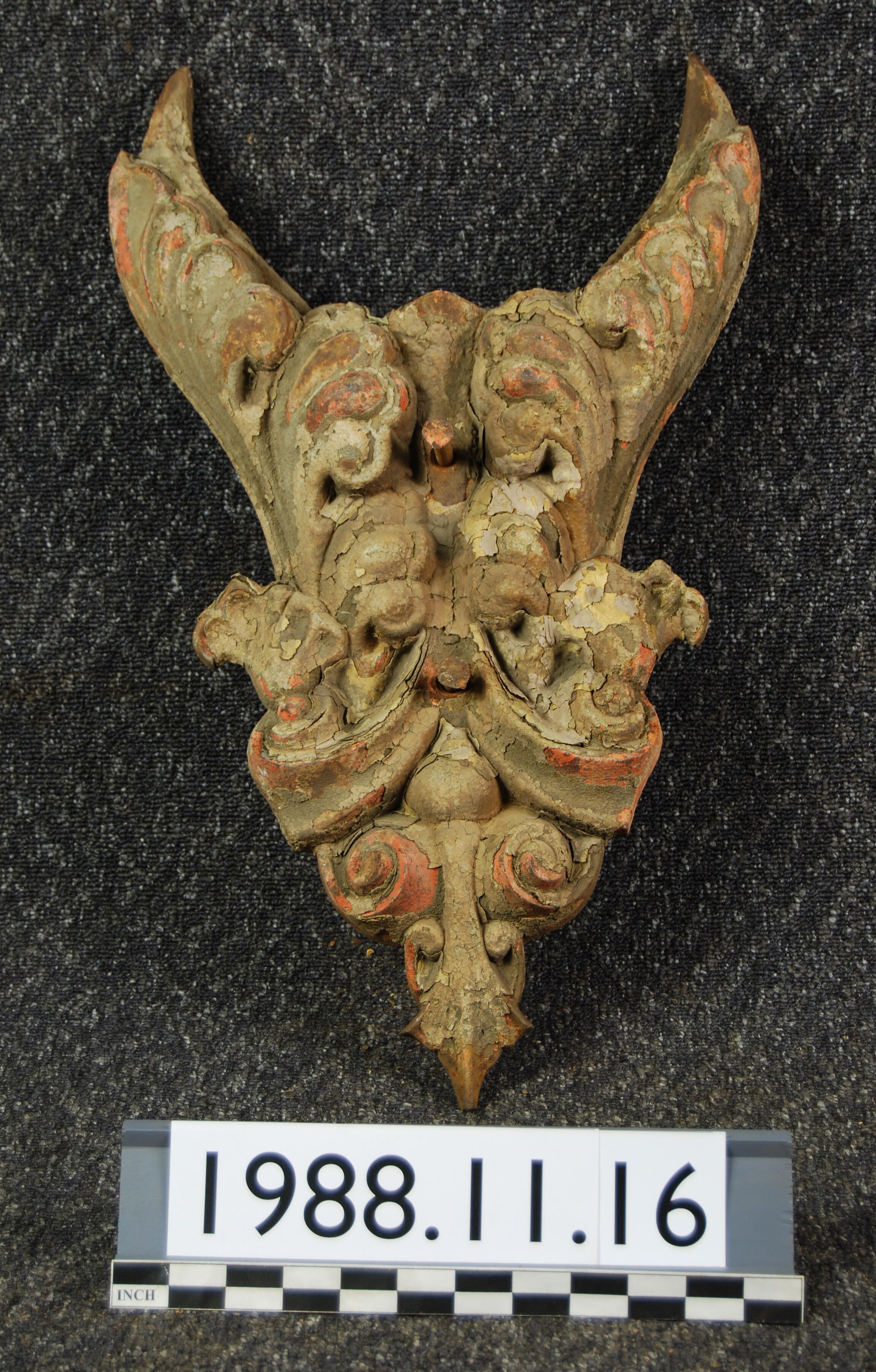 Cast iron ornament. Originally installed on Abington Building front facade, third floor at level near window arch.