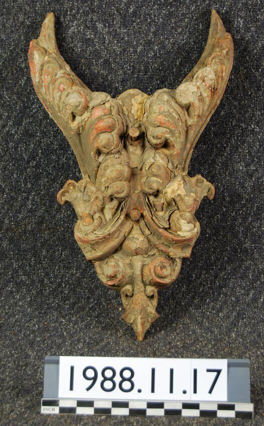 Cast iron ornament. Originally installed on Abington Building front facade, third floor at level near window arch.