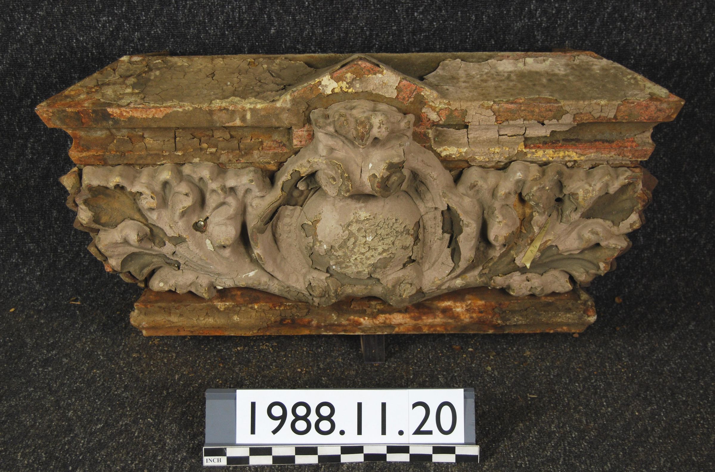 Cast iron capital. Originally installed on Abington Building front facade, third floor below window arches.