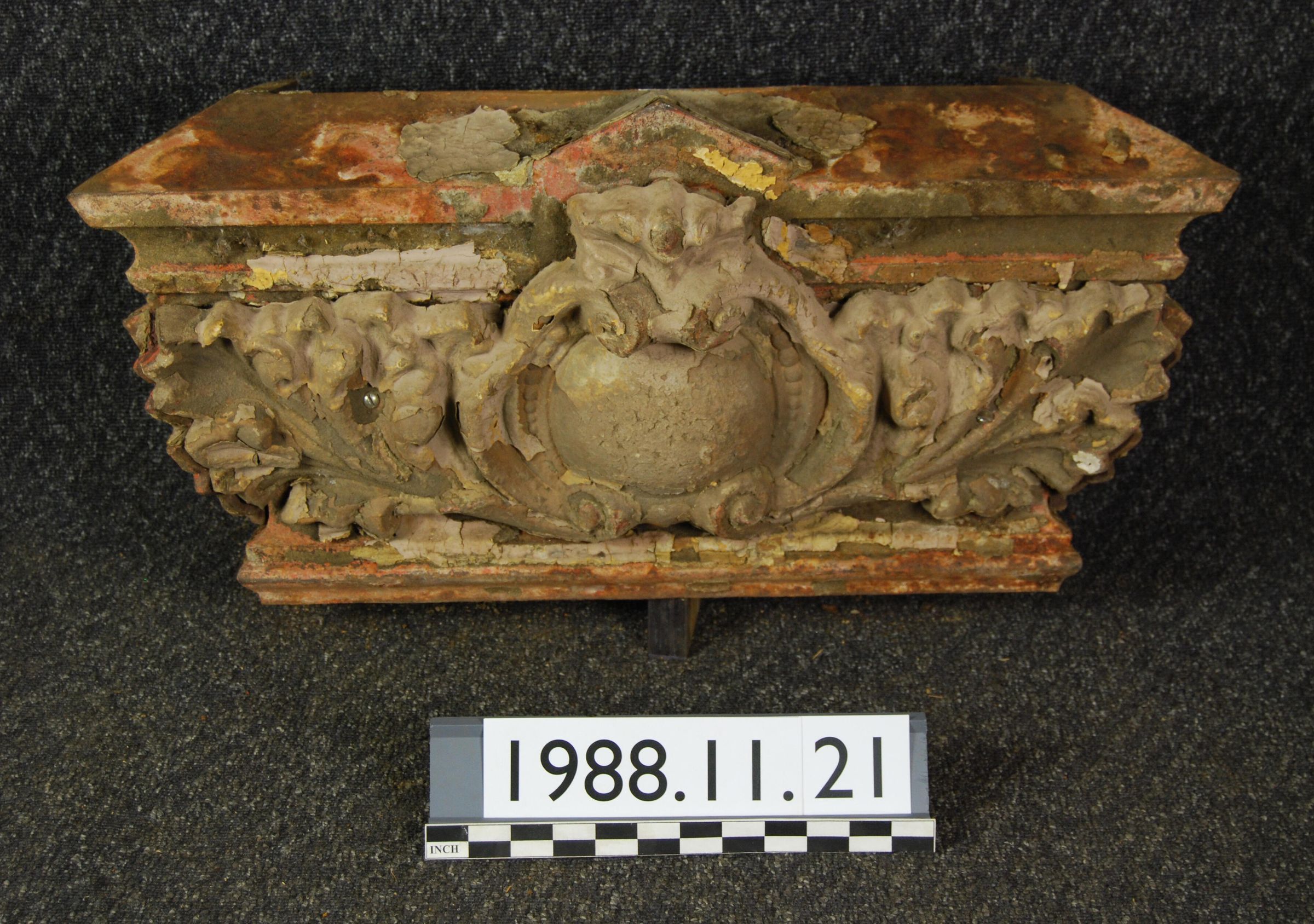 Hollow block with sloping top. Small pediment at center of top front. Applied acanthus and spherical shield with scroll motif attached to front. Acanthus motif ornaments applied to two sides. Molded edges above and below applied ornaments.