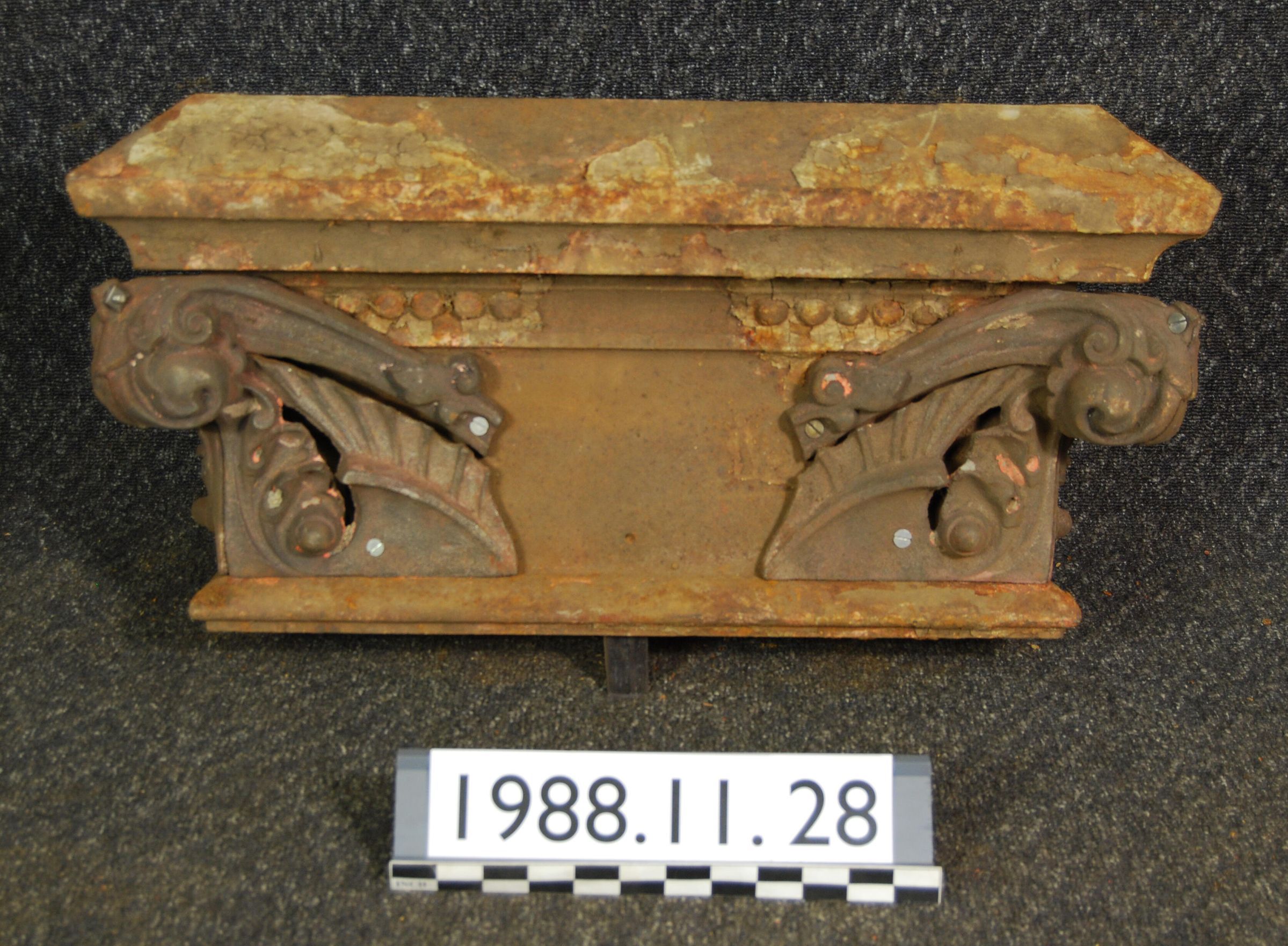 Applied ornaments bolted on front are incomplete. Central motif is missing. Has botanical motif volutes symmetrically arranged and repeated at each side of capital.