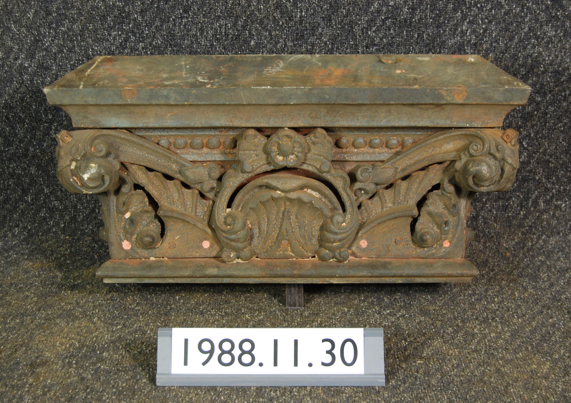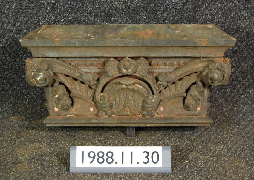 Cast iron capital. Originally installed on Abington Building front facade, second or fourth floor.