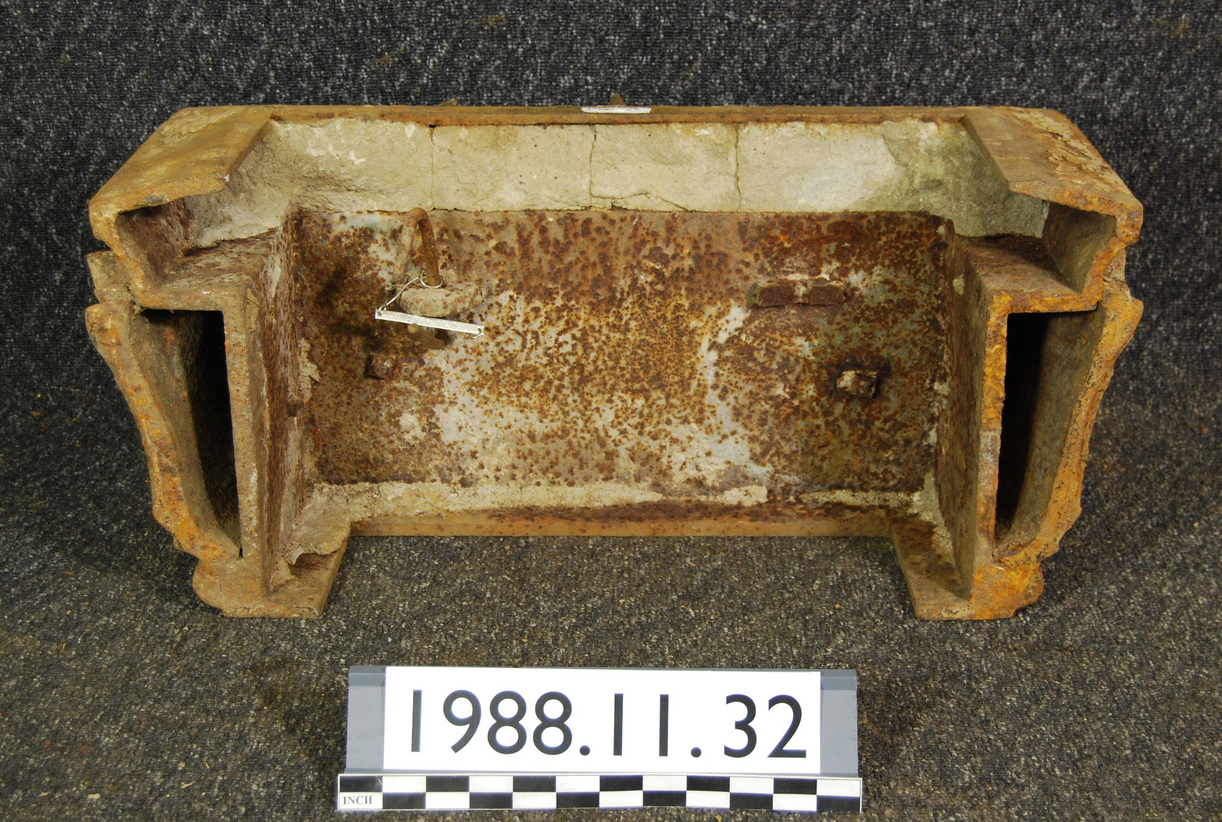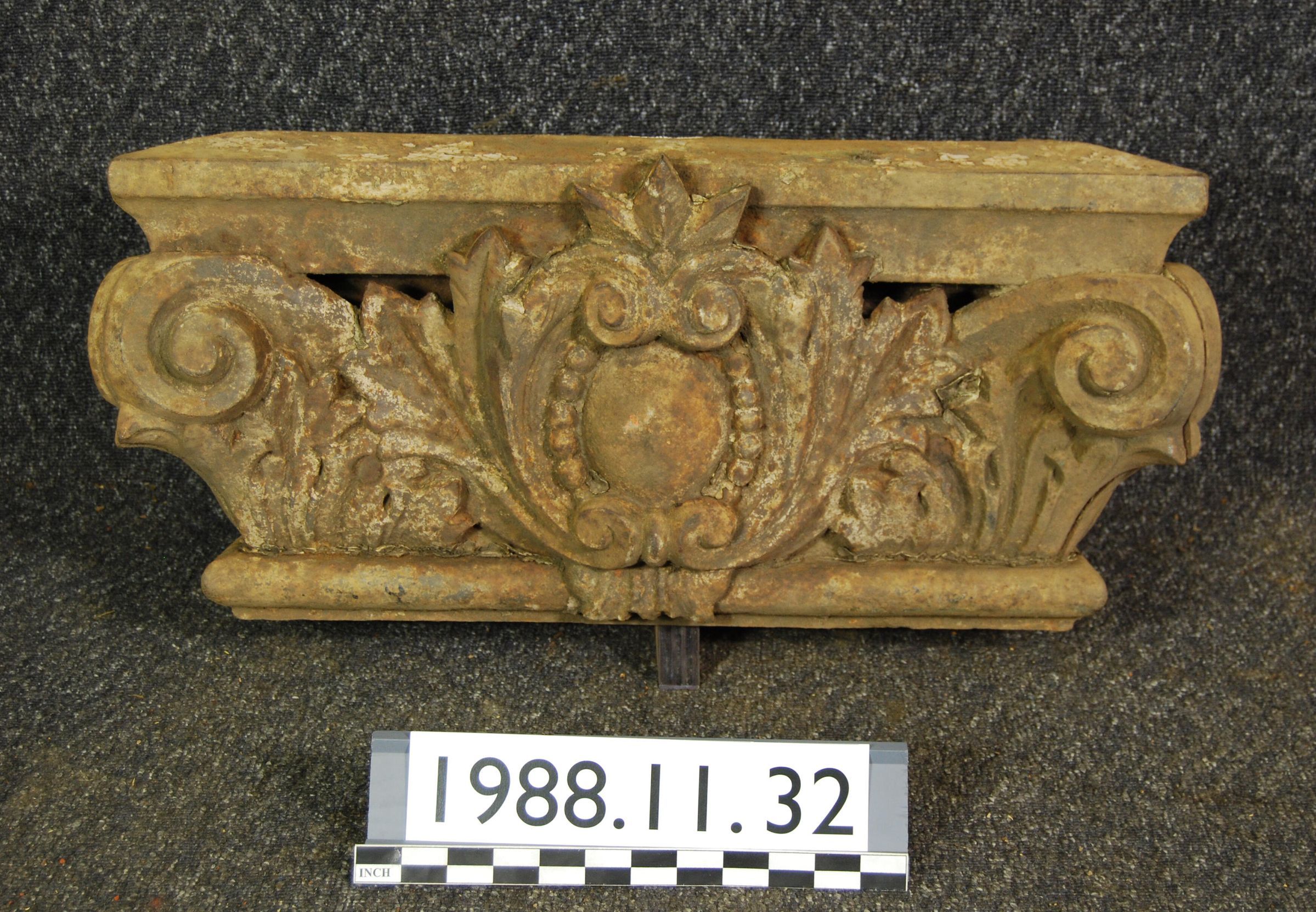 Cartouche and acanthus flanked on each side by volutes. Each side of capital has repeating acanthus and volute ornaments bolted on. Reverse originally had two eyelets for anchorage to masonry. One eyelet is missing, other eyelet has wrought iron loop.