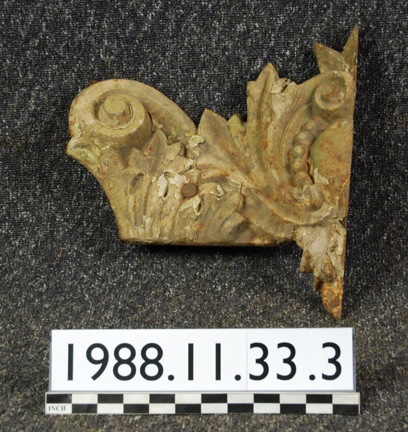 Approximately one half of shield-shaped ornament with acanthus leaf motif and volute. Trimmed to fit at original installation at capital adjacent to pilaster.