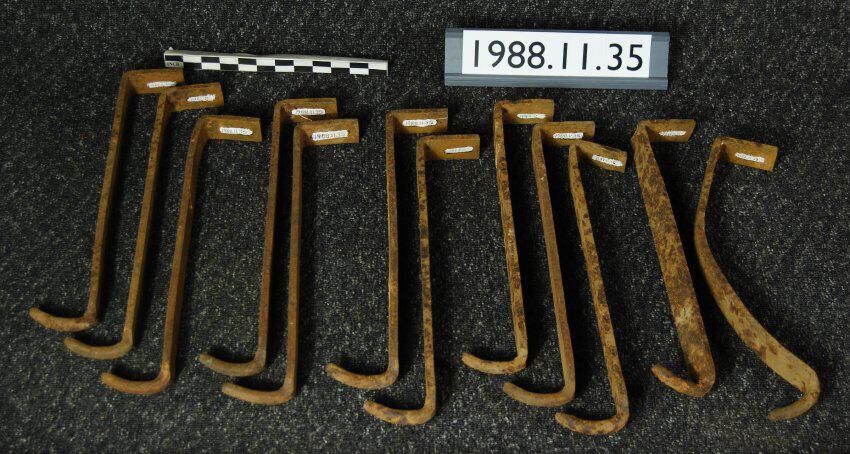 One lot of twelve wrought iron anchors originally used to anchor cast iron building components to masonry. Wrought iron bar. Forged on one end to form curved hook. Other end bent at angle.