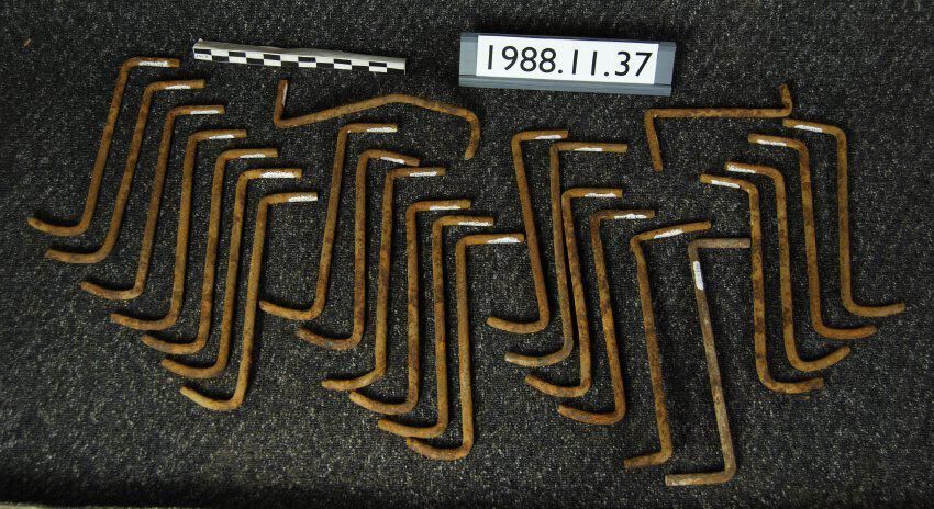 One lot of twenty-five wrought iron anchors originally used to anchor cast iron building components (or cornices) to masonry. Each anchor is one half inch diameter rod. One end bent at right angle. Other end bent to form curved hook.
