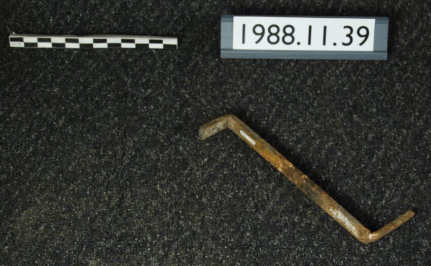 Wrought iron anchor originally used to anchor cast iron building components to masonry. Anchor is formed from bar. One end is drawn down to form round cross-section and bent at right angle. Opposite end is bent at right angle in opposite direction.