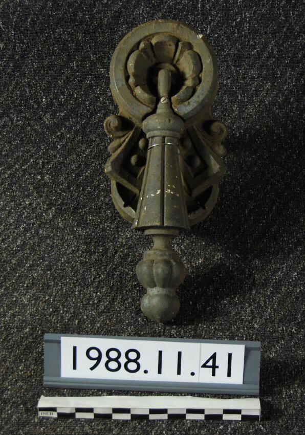 Cast iron ornament. Originally installed on McKay Building first floor pilaster. Tassel-shaped drop with scalloped motif mount. Finish has been stripped. Originally was sand texturized to simulate stone.