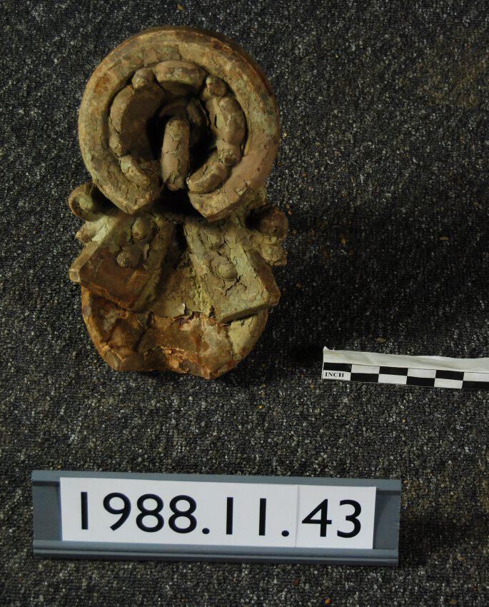 Cast iron ornament. Originally installed on McKay Building first floor pilaster. Scalloped motif mount only. Tassel drop missing.