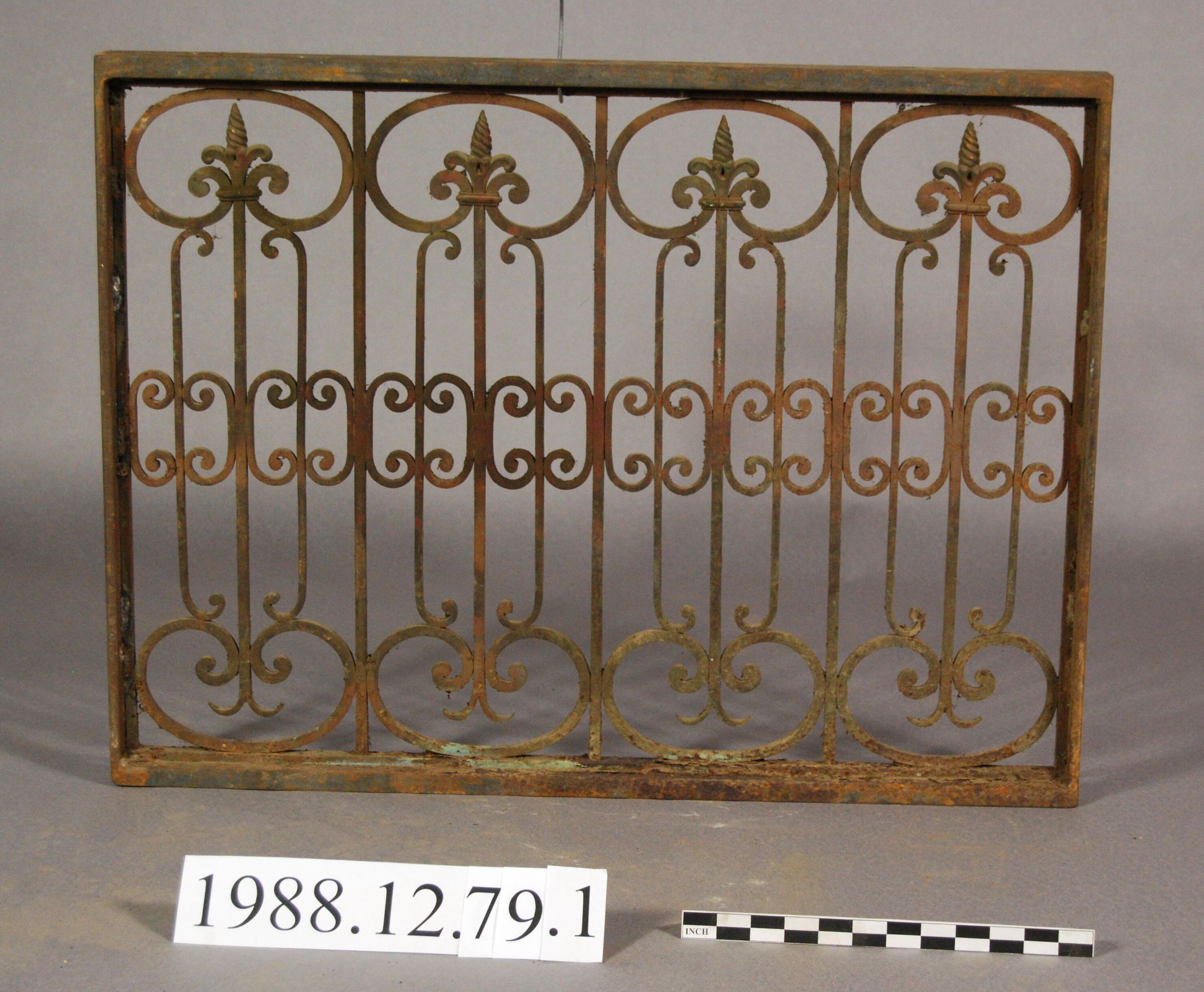 Rectangular grille. Has channel rail at top and bottom. Series of five vertical bars attached with riveted tenons. Elaborate scrolled infill. Series of four fleur-de-lis finials. within grille frame. Copper plated finish. Has later bar frame welded around perimeter. Grille is of unidentified use. Possibly window guard or railing.