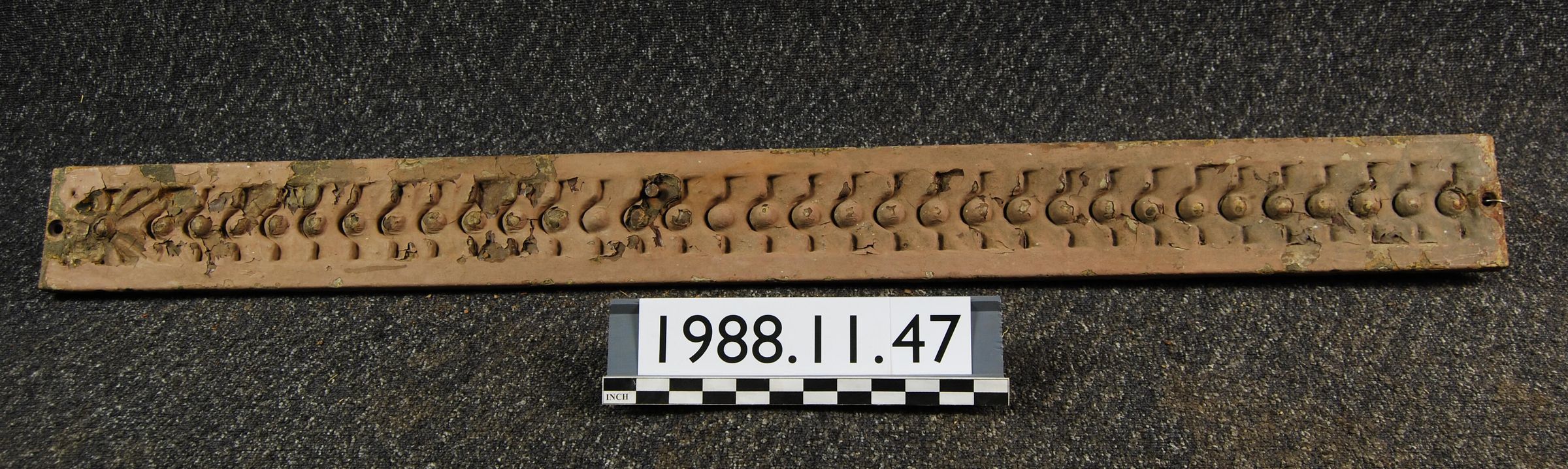 Cast iron ornament. Originally installed on McKay Building first floor pilaster. Rectangular plate with scale / bead motif.