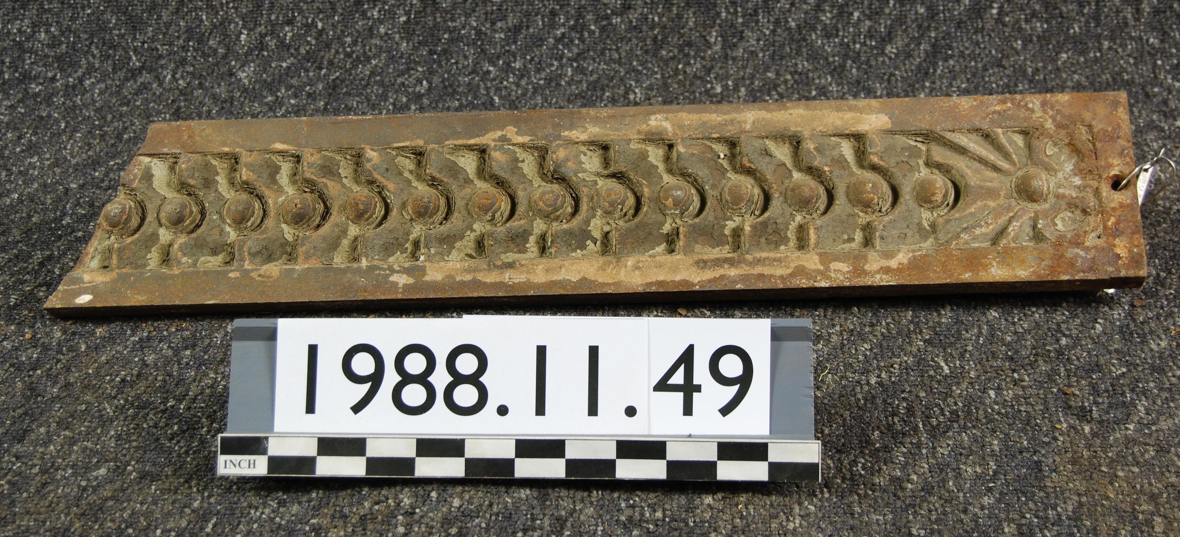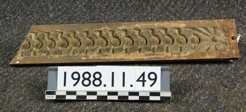 Cast iron ornament. Originally installed on McKay Building first floor pilaster. Rectangular plate with scale / bead motif Truncated at end.