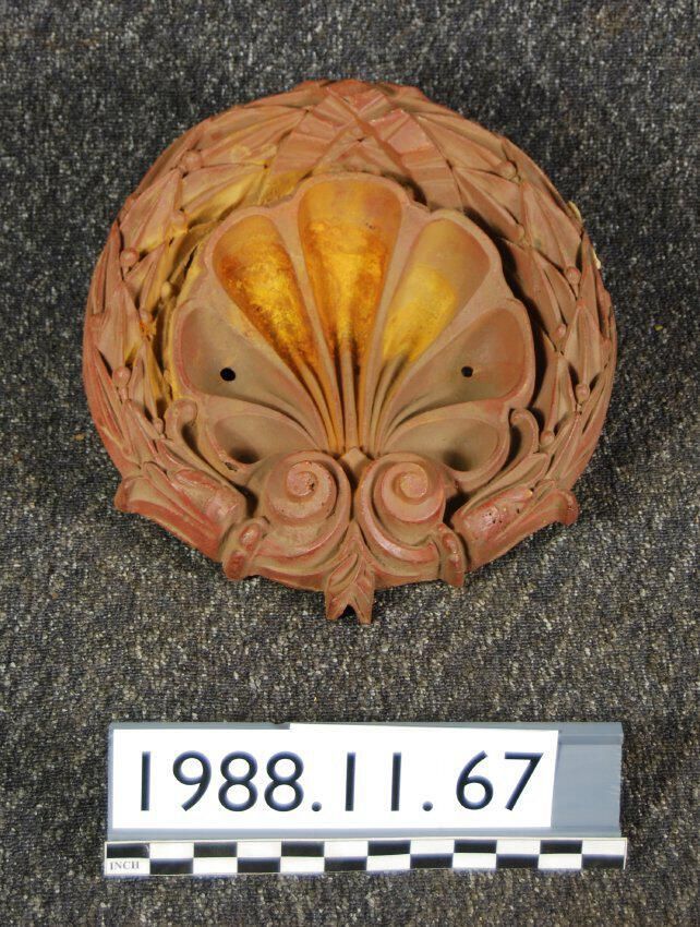 Cast iron circular medallion with wreath motif. Stylized scalloped shell center. Swag drop ornament is missing. Painted with red primer.