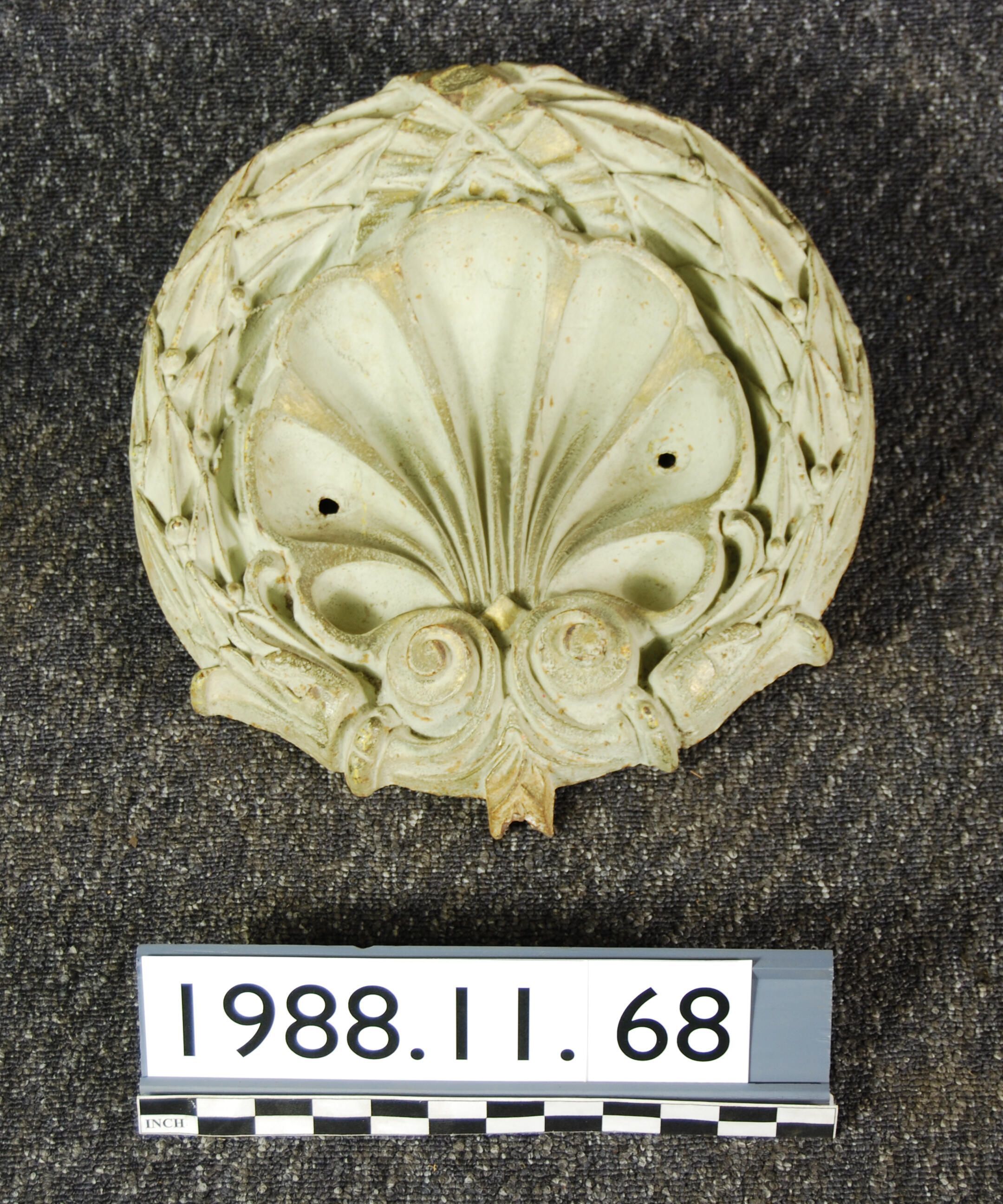 Cast iron circular medallion with wreath motif. Stylized scalloped shell center. Swag drop ornament is missing. Painted green with brass colored high lights. Modern aluminum TAG on back with inscription: "Old Spaghetti Factory 5152."
