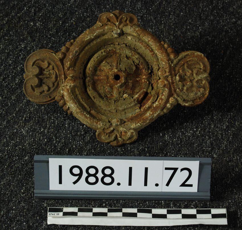Cast iron medallion with circular rosette center. Scroll / acanthus / beaded appendages. Painted with multiple layers of paint.