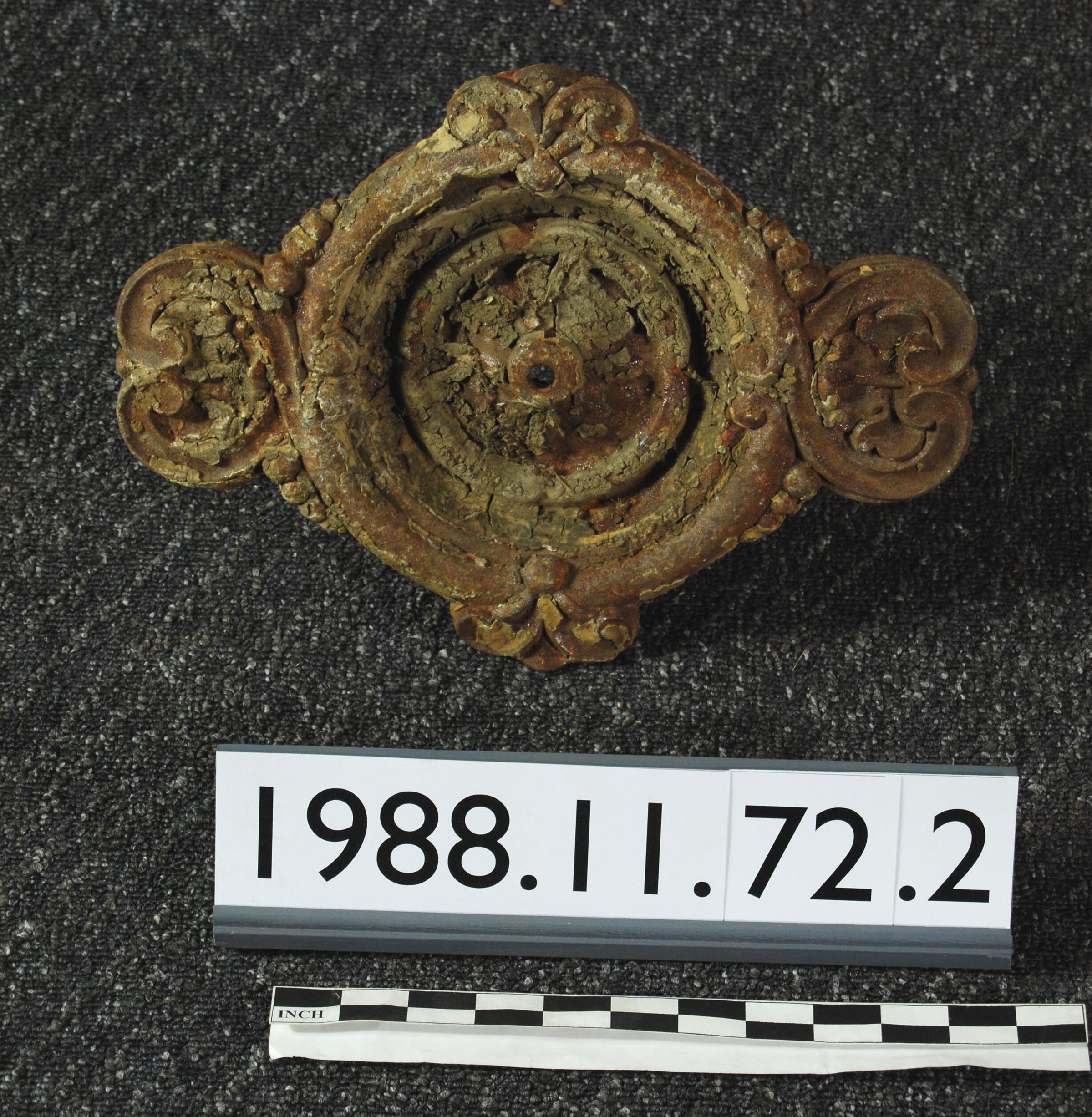 Cast iron medallion with circular rosette center. Scroll / acanthus / beaded appendages. Painted with multiple layers of paint.