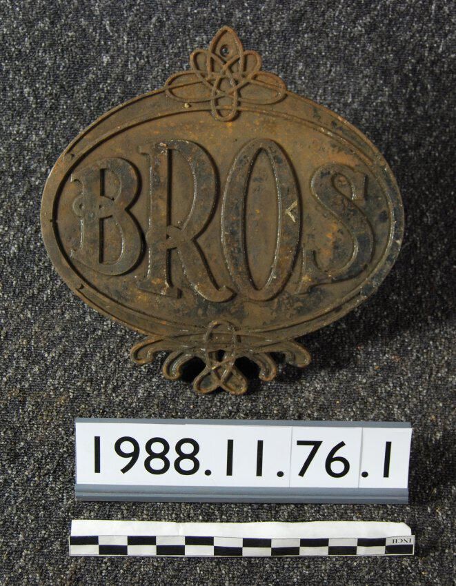 Cast iron ovoid medallion with ornamental appendages at top and bottom. Raised inscription: "BROS". Two counter-sunk bolt holes for mounting. Painted black.