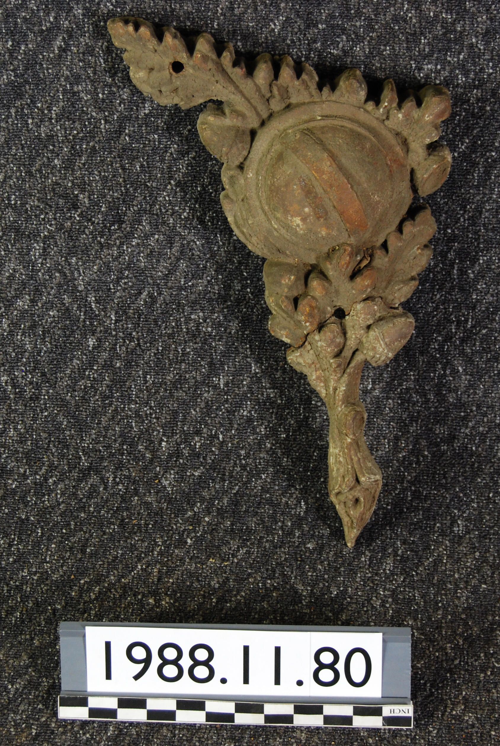 Cast iron ornament with semi-spherical center, surrounded by acorn and oak leaf botanical motifs. Quasi-triangular outline. Has two holes for mounting. Multiple layers of paint. Casting broken into two pieces.