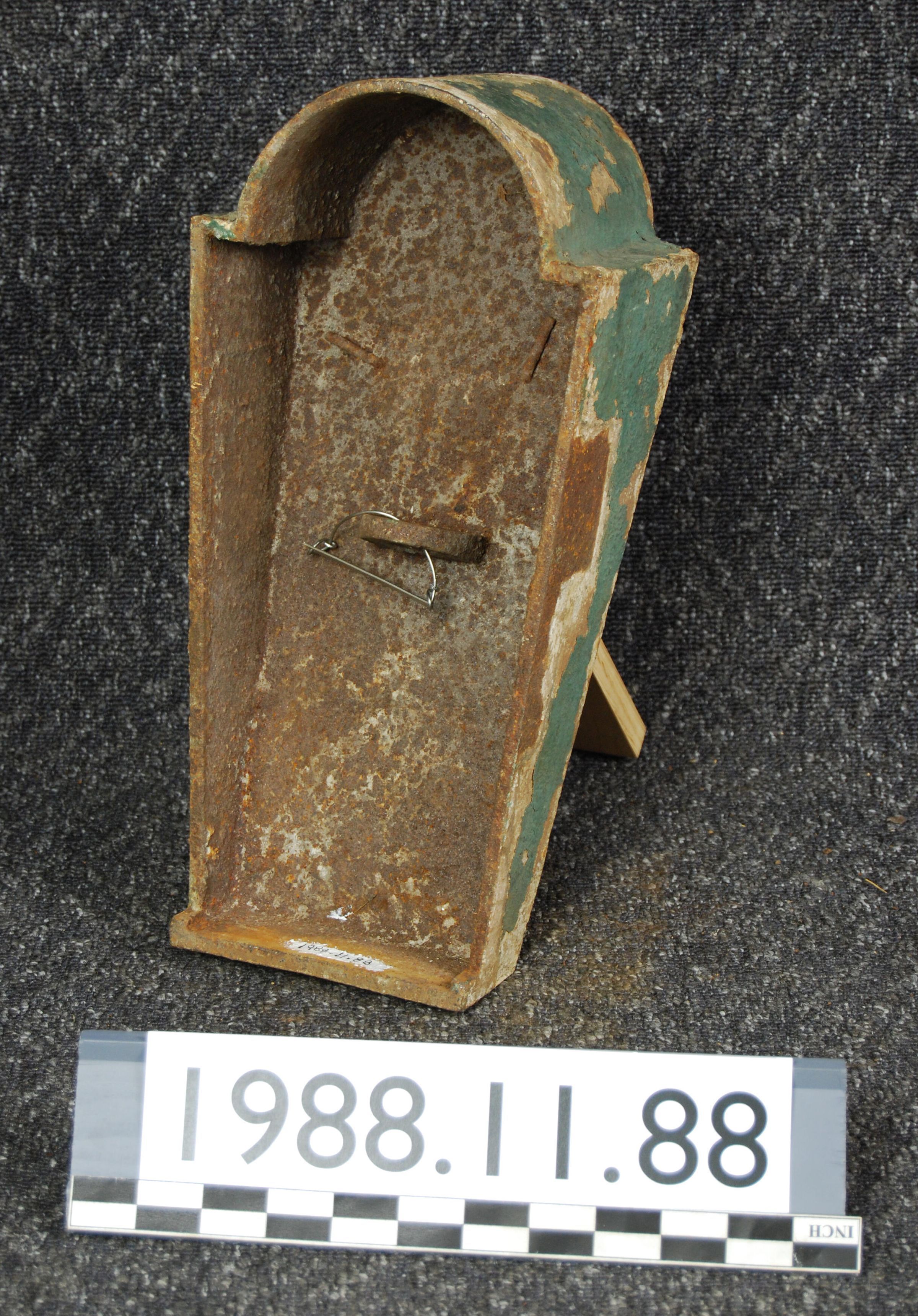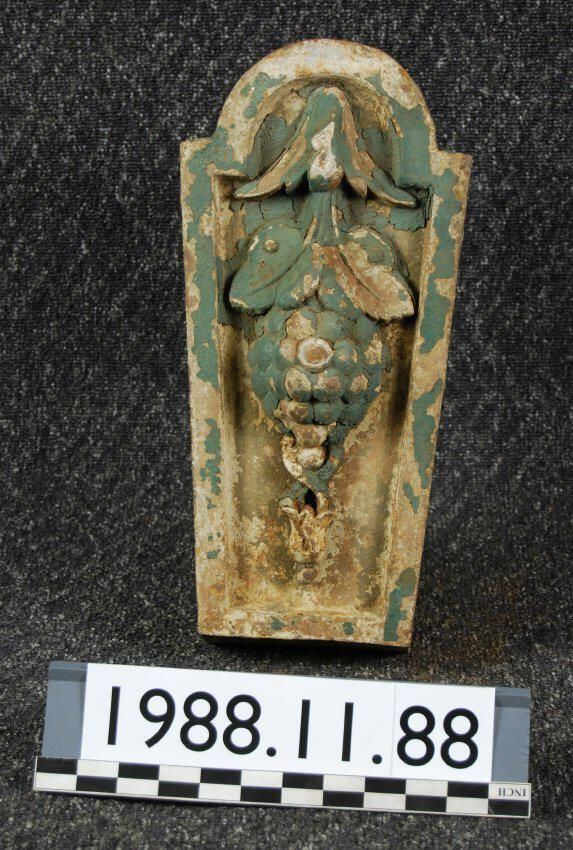 Cast iron keystone with arched pediment top. Wedge shaped hollow body. Front has recessed panel with applied botanical / fruit motif ornament. Sides have ghost profile of arch molding.