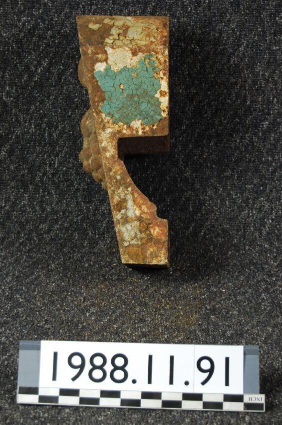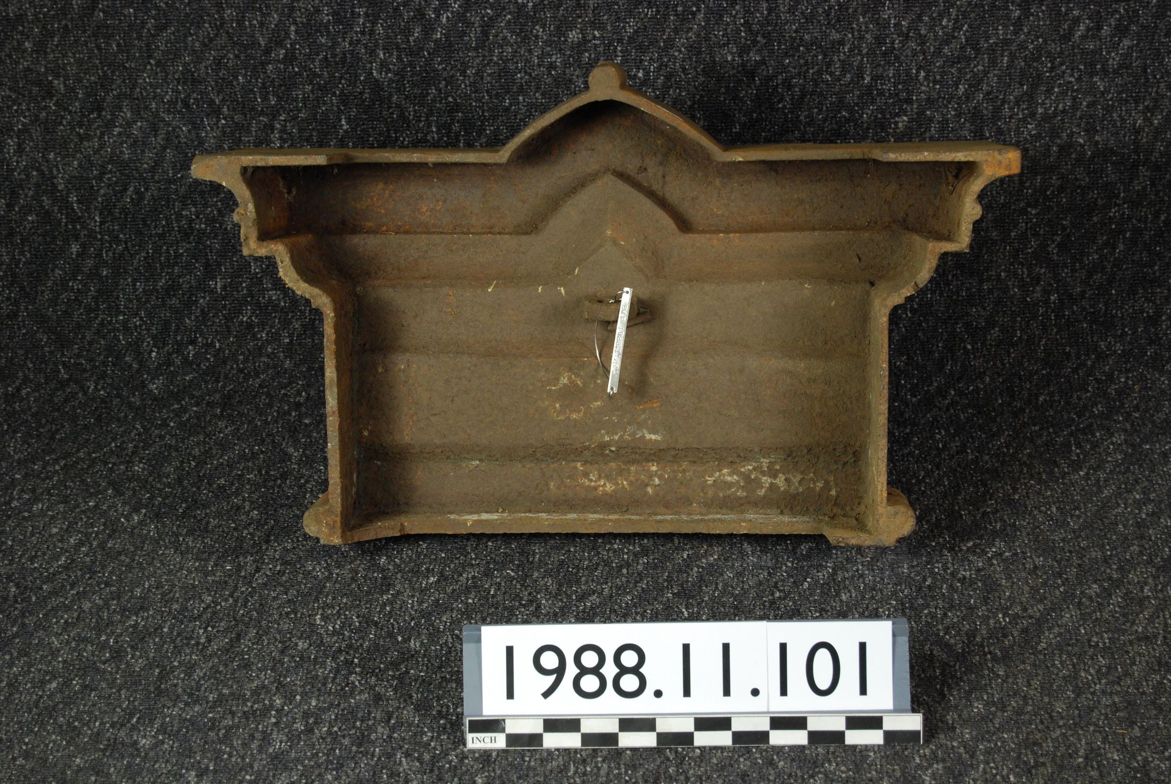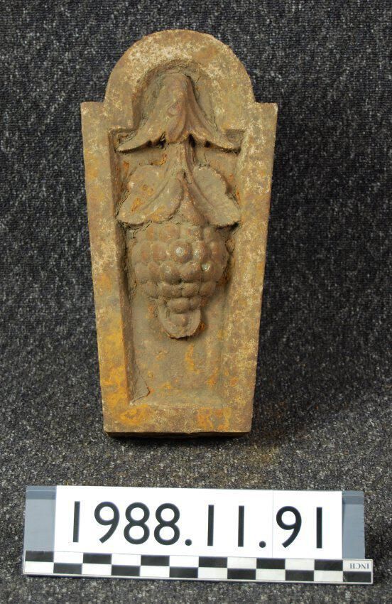 Cast iron keystone with arched pediment top. Wedge shaped hollow body. Front has recessed panel with applied botanical / fruit motif ornament. Sides have cut-out profile of arch molding.