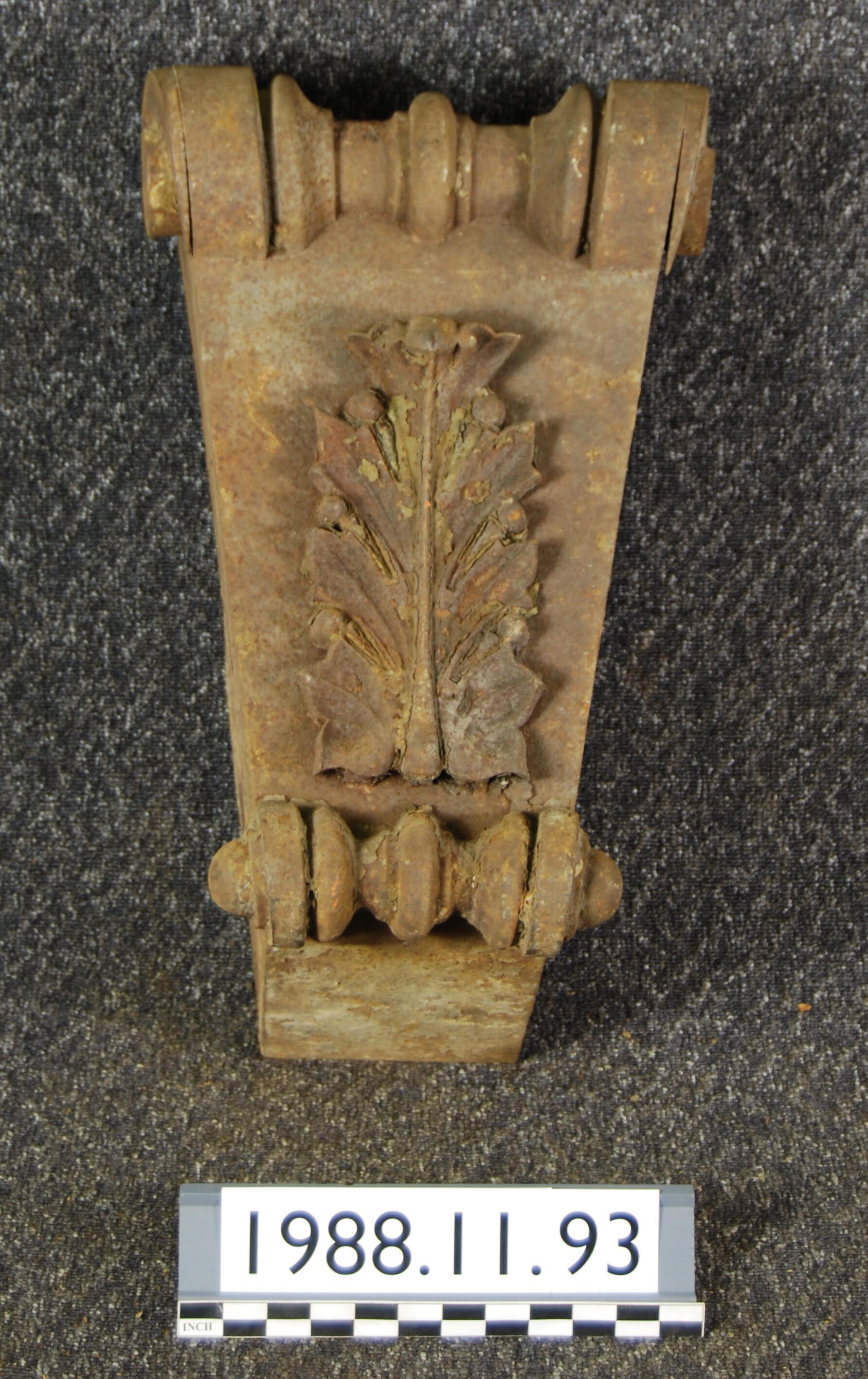 Cast iron keystone with wedge-shaped hollow body. Front top has reel with scrolled sides. Front center has applied acanthus leaf motif. Bottom has reel with semi-spherical sides. Reverse has eye for mounting to masonry.