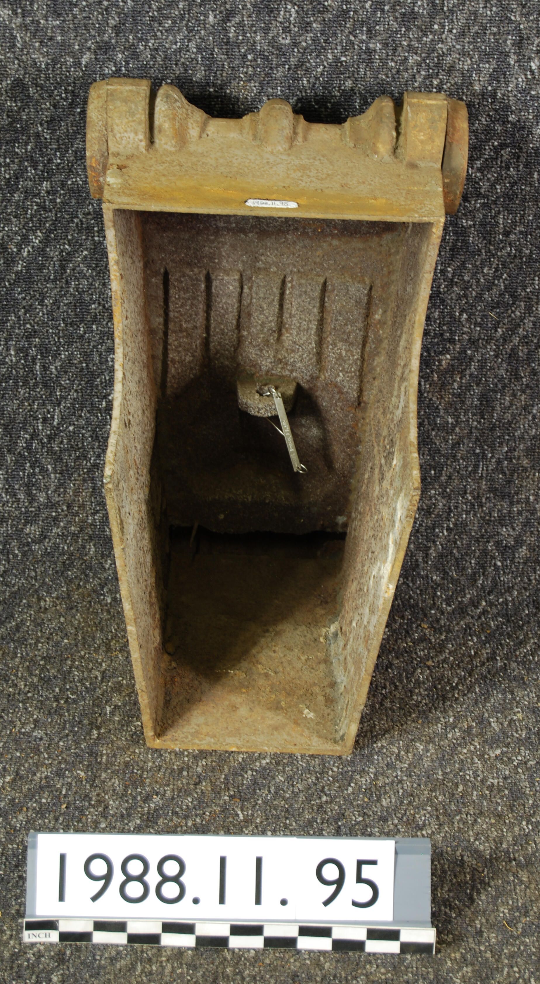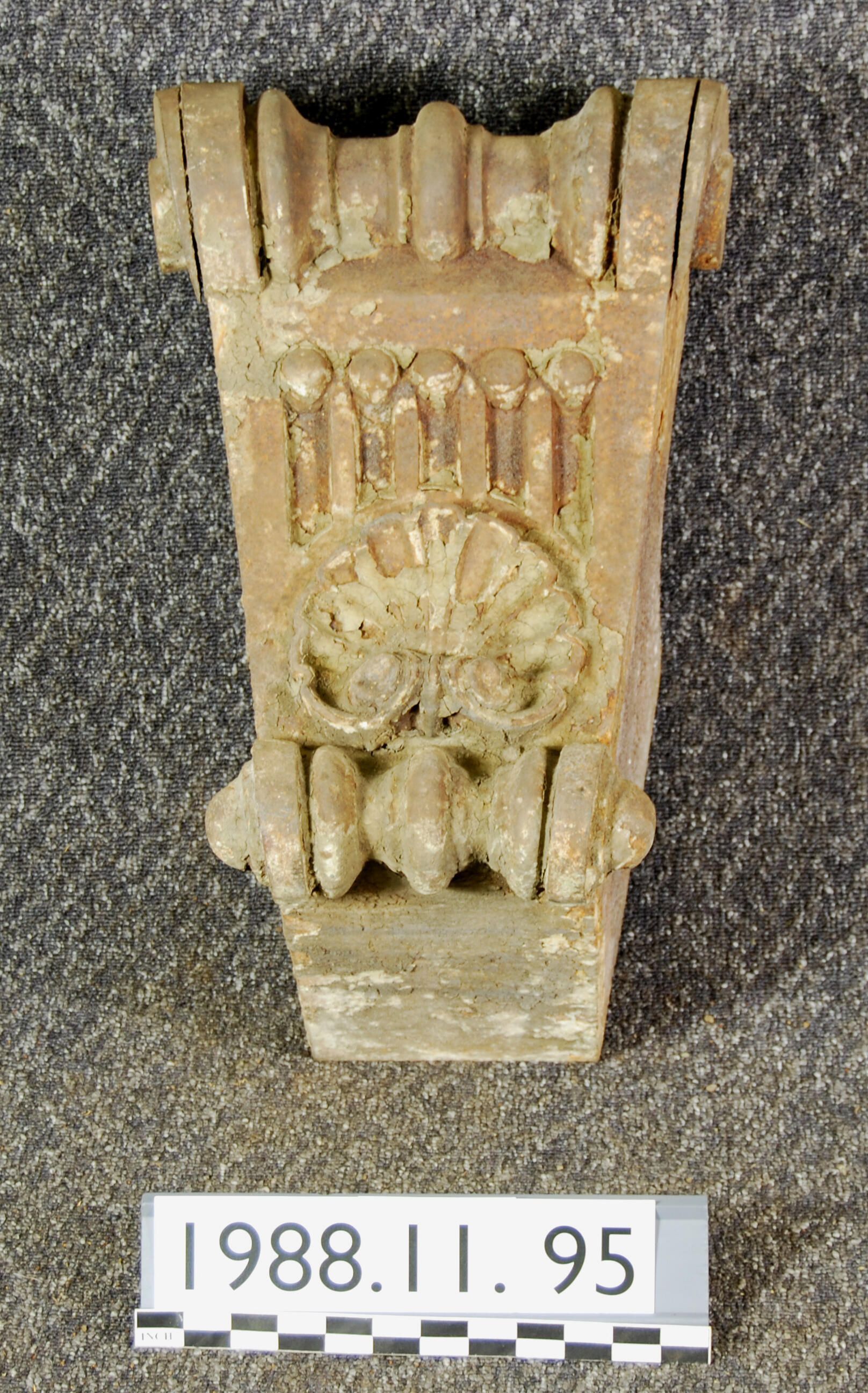 Cast iron keystone with wedge-shaped hollow body. Front top has reel with scrolled sides. Front has beaded / fluted ornamentation and scalloped shell motif. Bottom has reel with semi-spherical sides. Reverse has eye for mounting to masonry.