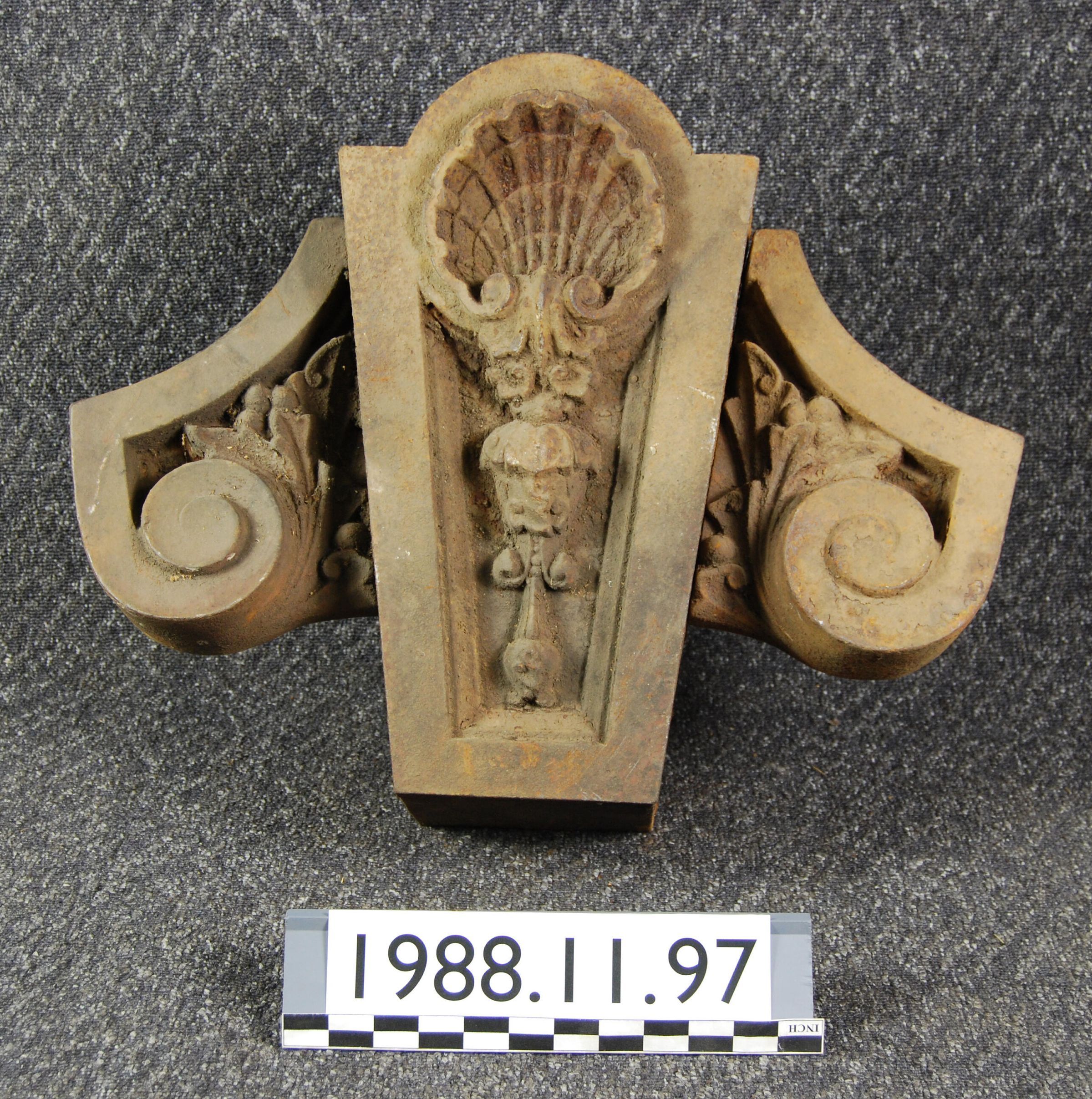 Cast iron keystone with wedge-shape hollow body. Arched pediment top. Front has scalloped shell and botanical motif ornamentation. Each side of keystone has scroll and botanical motif projecting "ear" appendage attached with modern replacement bolts. Reverse has eye for mounting.