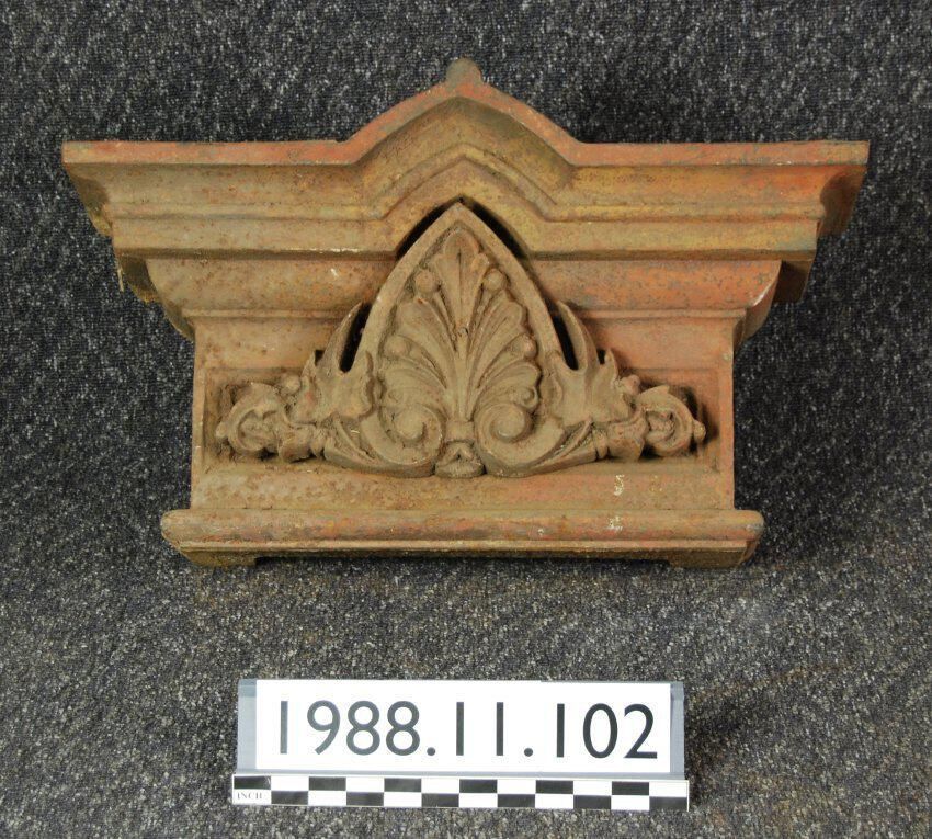 Cast iron pilaster ornament. Hollow block with pediment at top center. Upper and lower edges have compound molding profiles with returns at each side. Recessed fluted panel at front. Applied ornament (installed in front of panel) with anthemion / botanical motif. Reverse has eyelet for mounting.