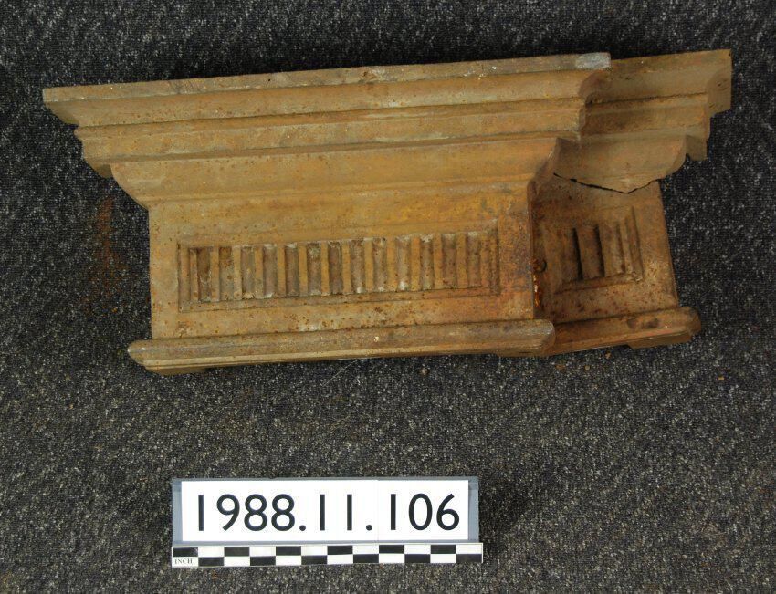 Cast iron pilaster ornament. Originally composed of three separate castings. Central casting is hollow block. Upper and lower sides have compound molding profiles with returns at each side. Small piece missing from side. Fluted panel at front. Central casting is flanked on right side with smaller casting of same design stepped back from main casting. Smaller casting is broken and missing pieces. Reverse has cast iron bracket and wrought iron bolt. Each casting has iron eye for mounting.