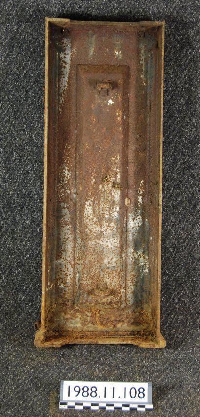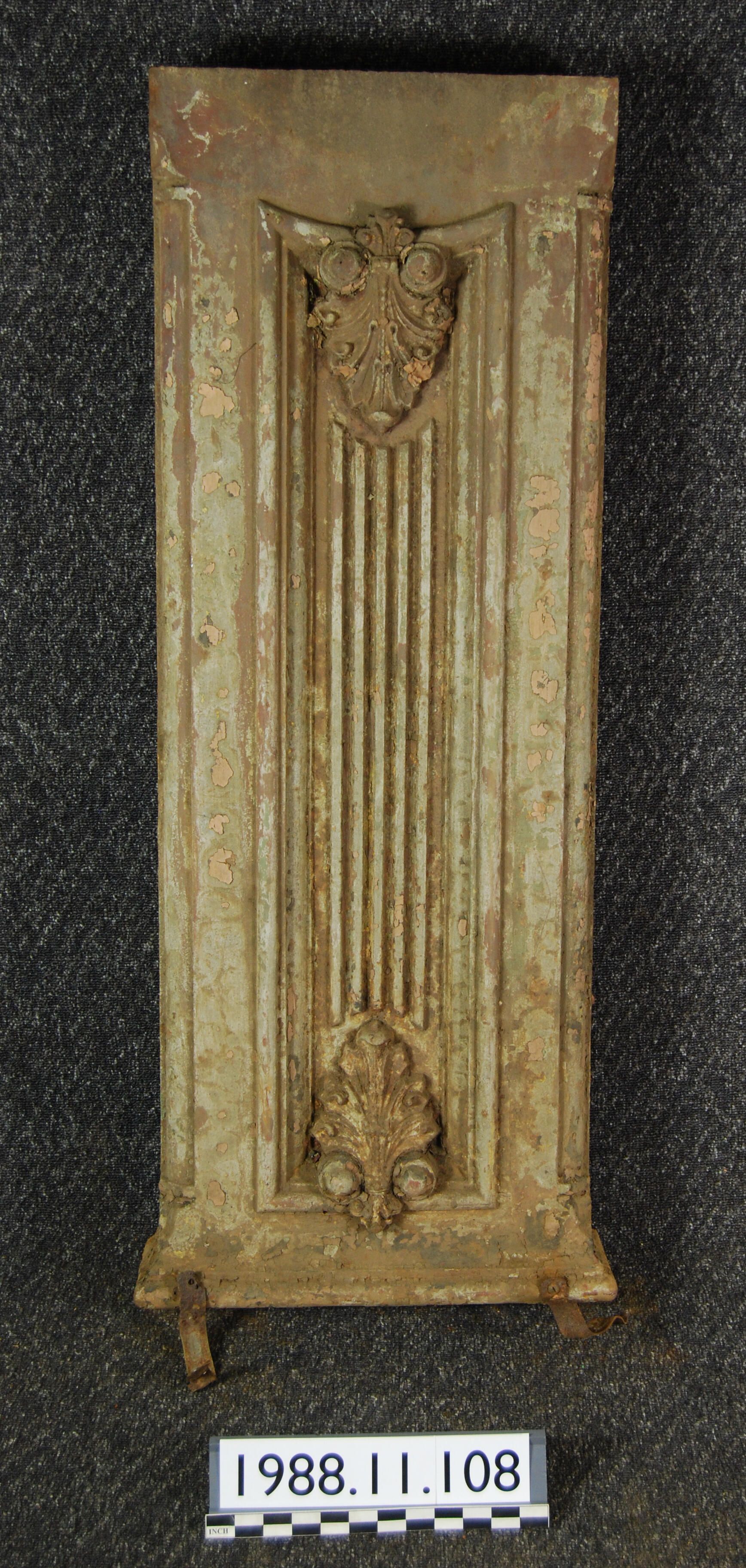 Cast iron pilaster. Top has compound molding profile. Front / side edges have chamfered / molded edges. Front has vertically fluted panel with applied botanical motif ornaments - one at top of panel and one at bottom. Reverse has two iron eyes for mounting.