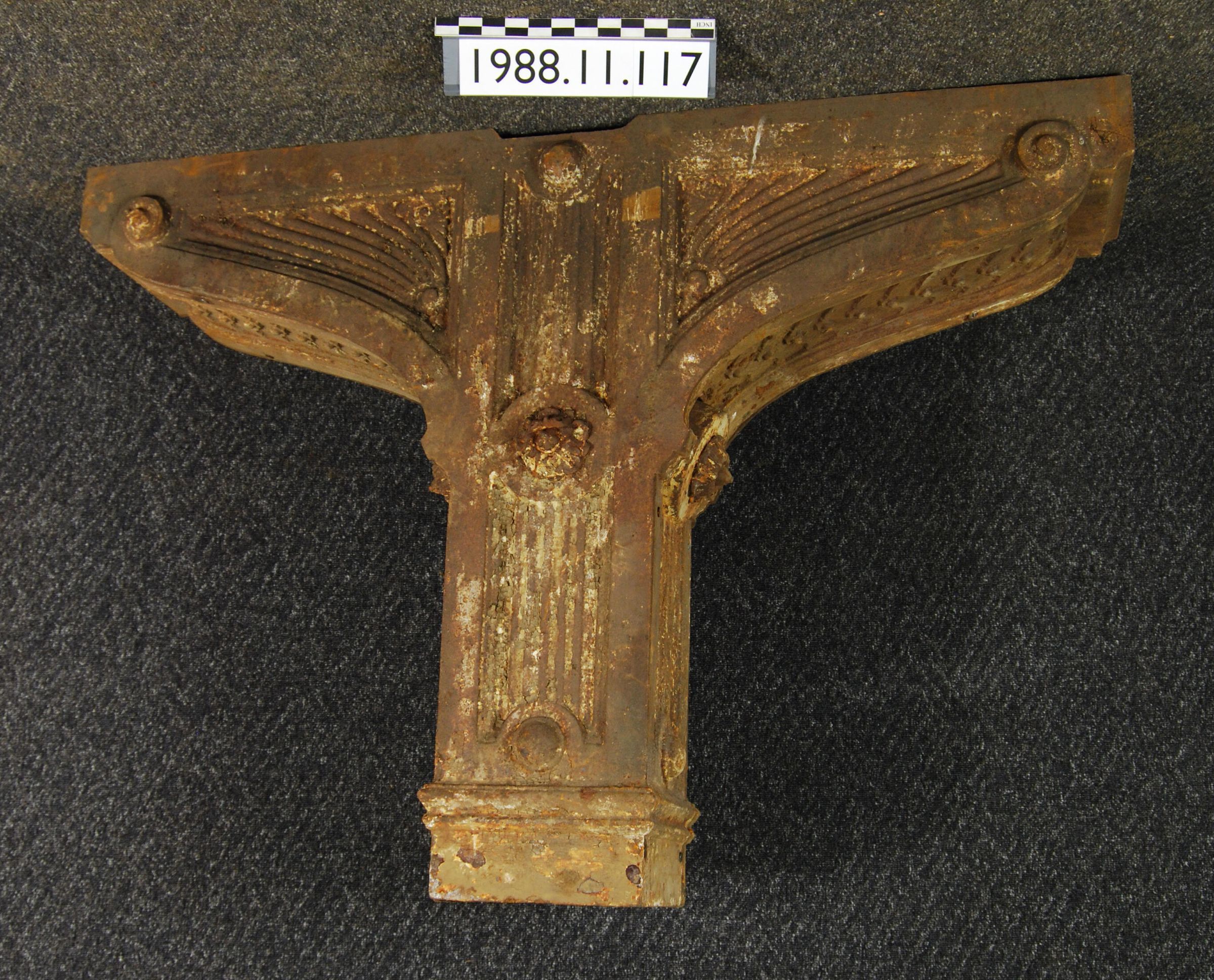 Cast iron "T" shaped hollow box spandrel. Composed of six separate castings. Front and back plates have scrolled ornamentation. Recessed panels with fluting. Rosette bolted onto center of plate. Reverse of each plate has series of tabs with threaded holes for mounting bolts. Each respective side of spandrel has set of two interlocking plates which have holes for bolts. Upper plate has recessed panel with scaled ornament. Lower plate has recessed panel with fluting. Has rosette bolted on.