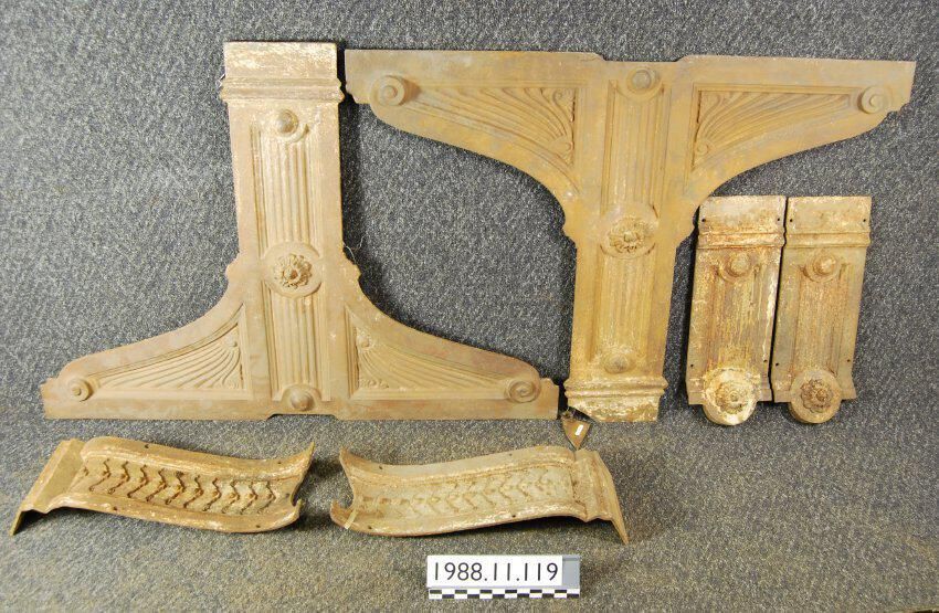 Cast iron "T" shaped hollow box spandrel composed of six separate castings. Front and back plates have scrolled ornamentation. Recessed panels with fluting. Rosette bolted onto center of plate.