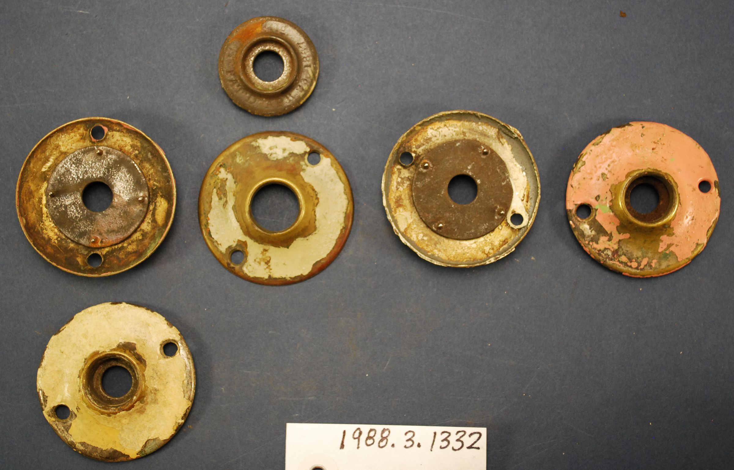 Comments: Five roses, five backer plates (cast iron) each cast iron backer with patent information. Each escutcheon plated with white colored metal.Lexicon