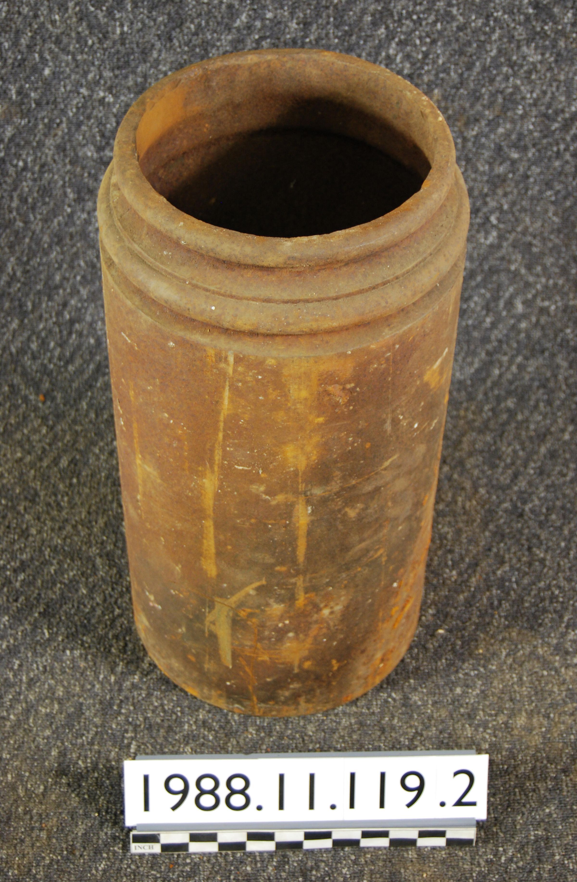 Cast iron hollow cylindrical column base. Upper edge has compound molding profile.