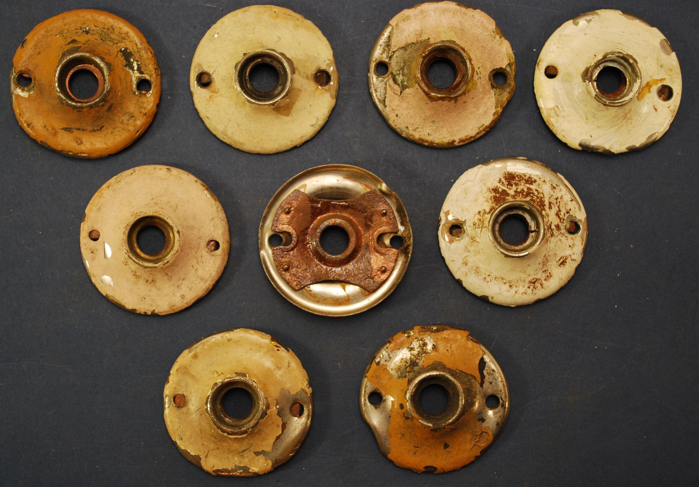 Comments: Nine roses, nine backer plates (cast iron, plated). Each escutcheon originally nickel plated, later painted. Appears to be matched set.Lexicon
