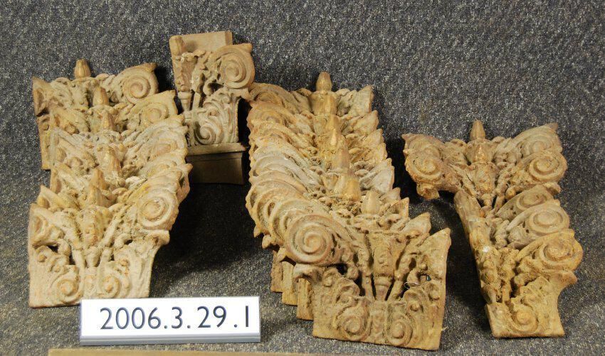 One lot of twenty-five cast iron ornaments originally installed on 1883 Smith and Watson Building second or third floor capitals.Acanthus and volute motif ornaments from sides of capitals or incomplete frontal ornaments. Remnants of sand texturized paint on each piece.Various dimensions.