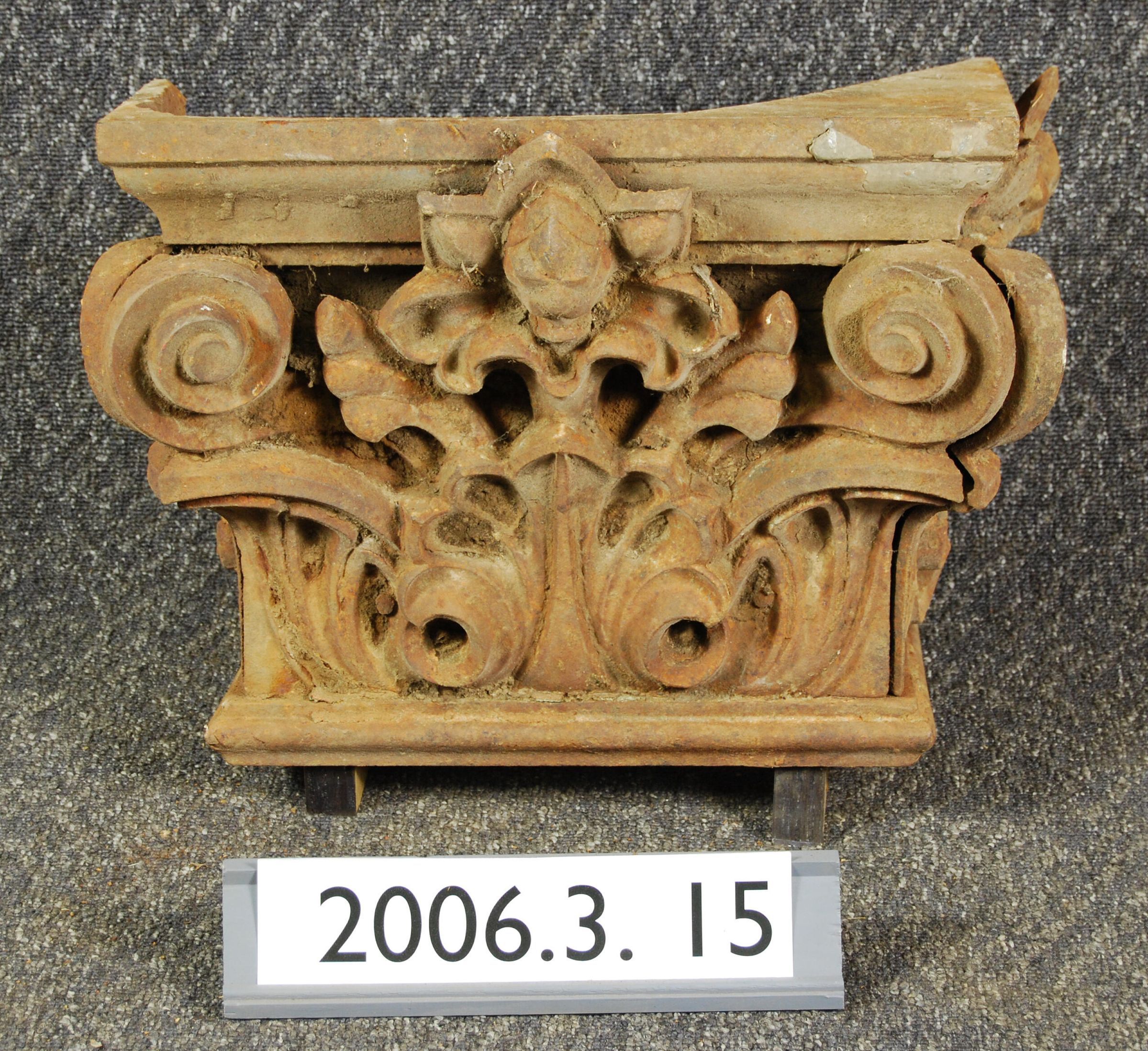 Hollow block with compound molding at top and bottom edges section of top is missing,block has return at sides,applied acanthus and volute ornaments on front and two sides,trimmed down on each respective side..Reverse has eyelet for anchorage to masonry.Front and sides have few remnants of paint.