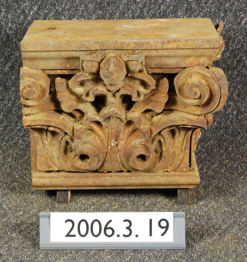 Hollow block with compound molding at top and bottom edges,return at right side,applied acanthus and volute ornaments on front and right side,both trimmed down . Reverse has eyelet for anchorage to masonry.Front and side have few remnants of paint.