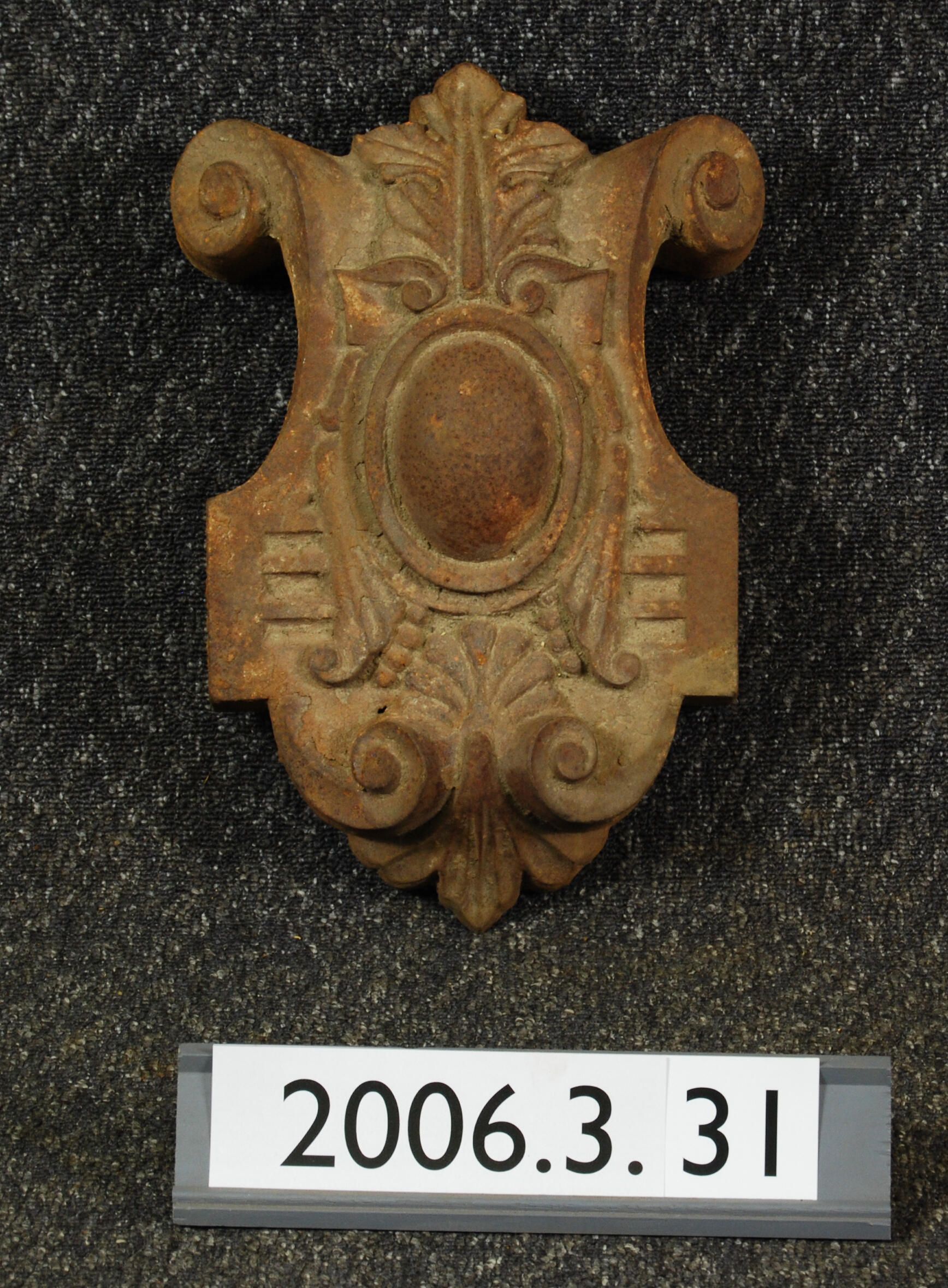 Hollow shield-shaped ornament with scrolled botanical motifs.Central egg-shaped motif.Reverse has eyelet for anchorage to masonry.Front has remnants of sand texturized paint.
